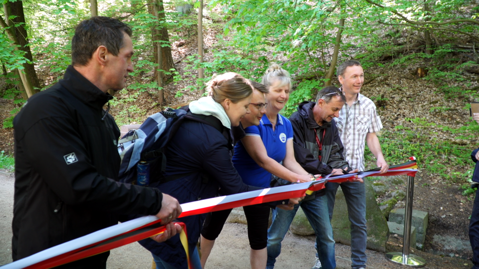 Bürgermeister Ralf Lehmann und Landrat Gernot Schmidt eröffnen den Märkischen Bergwanderpark in Bad Freienwalde mit Trimm-Dich-Pfad, Kneipp-Strecke und Gesundheitsweg "Atem schöpfen". Das obligatorische Band schneiden auch Malwina Huczko, Marco Büschel, Karola Graf, Heiko Walther-Kämpfe und Roland Engelke durch.