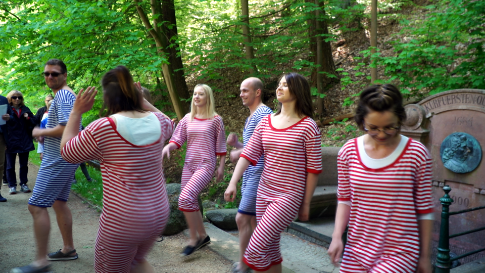 Die "Lustigen Sieben" tanzen von der Kurfürstenquelle bis in die Kneipp-Strecke. Mit dabei beim deutsch-polnischen Eröffnungsfest ist auch der rbb, der einen Wetterbericht dreht.
