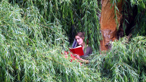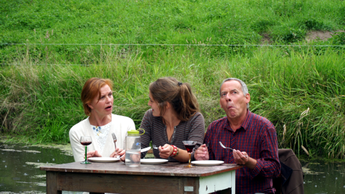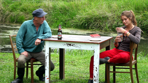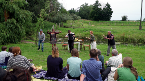 Sie erinnerte an vergangene Zeiten. Theateraufführungen im Schlosspark und vor dem Schloss Altranft waren immer ein Höhepunkt. Neu diesmal der Spielort und die Theatergruppe. Am Kanal an der Weide war der ideale Premierenort für das Stück "Bibergeil" der jungen Autorin Nikola Schmidt, die in lustiger und zugleich nachdenklicher Art gleich zwei Probleme auf die Wiese brachte: Das Erwachsenwerden und den Biber im Oderbruch. |