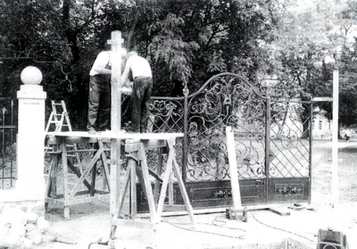 Das obere Foto zeigt den Wiedereinbau des Schlosstores nach der Restaurierung durch Fritz Anklam nach historischem Vorbild in kunsthandwerklicher Arbeit und im Original nachemfundener Farbgebung im Auftrag des Brandenburgischen Freilichtmuseums Altranft im Jahr 1990. |