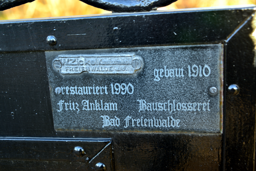 Das Eingangstor zum Schlosspark Altranft wurde im Jahr 1910 vom Schlossermeister und Kunstschmied Zickel in Bad Freienwalde gefertigt. |