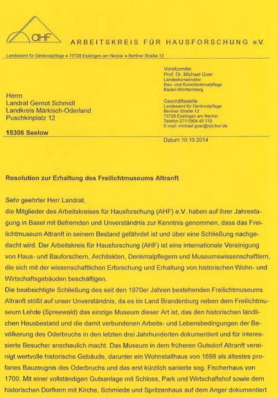 Schreiben des Vorsitzenden des Arbeitskreises Hausforschung e.V., Prof. Dr. Michael Goer, an den Landrat MOL