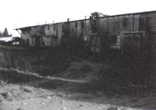 Das Osttorhatte ca. 25 Meter vor dem eigentlichen Zugang links ein Seitentor. Es war eine direkte Zufahrt zum Sägewerk. Das Sgewerk ist abgerissen, di eWindtourbine und der Brennereischornstein wurden Ender der 1940er Jahre abgebaut bzw. abgetagen.