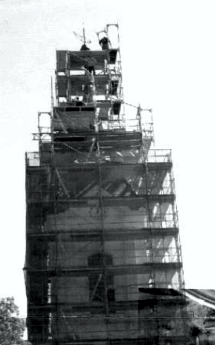 Der Kirchturm ist eingerüstet und notwendige Reparaturen wurden durchgeführt.