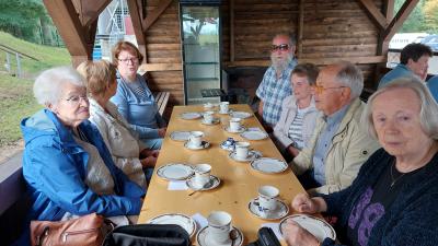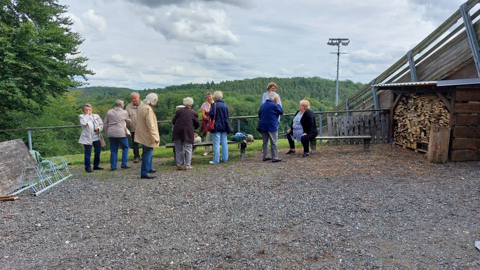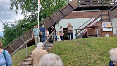 Die schönsten Ausflugsziele liegen nach wie vor um Bad Freienwalde. Und wenn das Wetter noch so passt wie am 30.8. bei Sonnenschein, moderaten Temperaturen und Windstille auf einem der höchsten Berge, dann geht es nicht besser. Dieter Ganzer hat mit Günter Grützner vom Wintersportverein Bad Freienwalde diesen Ausflug organisiert und wie so oft kann Jede/r dort alleine hinfahren oder auch laufen und tut es aber nicht. Wir 24 Frauen und Männer waren sehr dankbar, dass uns der Wintersportverein mit Kaffee und Kuchen inklusive Bedienservice empfangen hat. Bei der Begrüßung durch Günter Grützner, Pressesprecher des WSV, führte er uns durch die Geschichte des vor 100 Jahren gegründeten Wintersportvereins mit Unterbrechung bis zur Auflebung des Vereins am 3.1.2001. Auch Stefan Wiedmann, einer der ersten Skispringerkinder und heute amtierender Trainer begrüßte uns mit Informationen zum Training und der Skigrößen, die bisher von dieser Schanze gesprungen sind. |