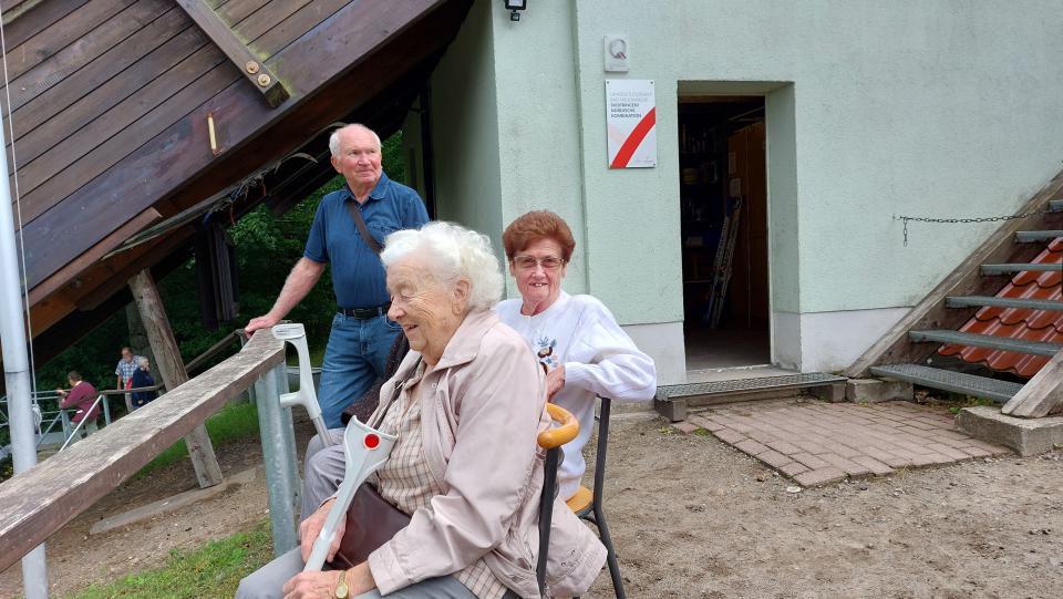 Schon vor dem Kaffeetrinken nutzten einige Mitglieder, die noch gut zu Fuß waren, den Aufstieg auf den Schanzenturm, um den unglaublich schönen Blick von oben zu genießen. Auch danach hatten alle, die es konnten, die Möglichkeit, ihre Fitness beim Treppensteigen zu erproben. Und als die älteren des Skispringernachwuchses dazu kamen, um den schnellsten Weg nach unten über die höchste Schanze zu nehmen, war das natürlich ein besonderer Höhepunkt. Aber auch die jüngeren Mädchen und Jungen, die von den kürzeren Schanzen sprangen, waren für uns die mutigsten Menschen in ganz Bad Freienwalde. Es war einfach ganz besonders für uns, die Skispringer so nah und live zu erleben. Wir sehen diese wagemutigen Kinder und den gesamten Wintersportverein heute mit anderen Augen und können ihnen allen nur Respekt und Hochachtung zollen. |