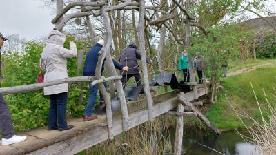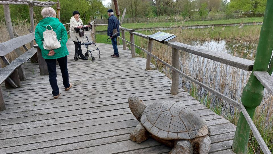 In kleineren Grüppchen erkundeten wir das Gelände mit Schafen und Schildkröten. Den echten Exemplaren war es an diesem Tag zu kalt, so dass wir nur die ganz großen aus Holz bewundern konnten. Auf der ganzen Fläche waren Skulpturen aus Holz zu sehen oder aus Weide gewachsene und geformte, besondere Bänke zum Ausruhen, Aussichtspunkte und eine attraktive Wackelbrücke für jung und alt. Wir waren alle sehr angetan von diesem besonderen Gelände und wissen, dass wir mit unseren Familien wiederkommen werden. Als es zu tröpfeln anfing, haben wir das Café aufgesucht, um uns mit Kuchen und anderen Angeboten zu stärken. Joachim Buß stellte dann fest, dass Günter Rohr noch nicht da war. Er wollte sich die Schafe ansehen, die ziemlich weit hinten im Gelände weideten. Klaus Schluchter und Dieter Ganzer sind dann noch einmal los, um ihn zu suchen. Zum Glück war er schon in der Nähe, aber ganz schön erschöpft und wir heilfroh. Der Kuchen hat ihm doppelt so gut geschmeckt. Trotz dieser kleinen Aufregung war es ein wunderschöner Ausflug und wieder sehr unterhaltsam für alle Beteiligten. |