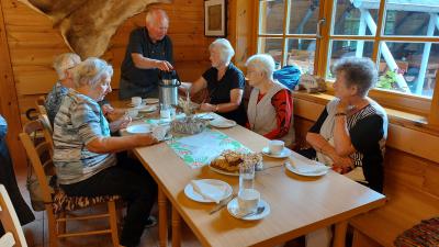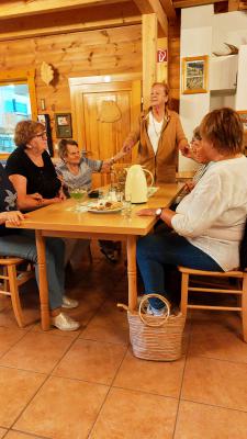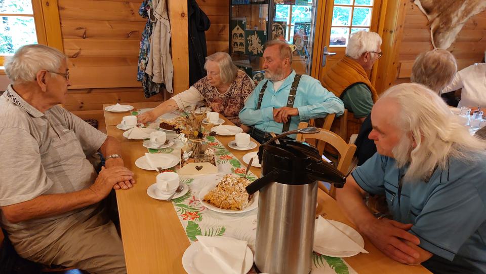Als wir ankamen, stand bereits der Kuchen und Kaffee auf den Tischen und wir hatten ein Stündchen Zelt zum Erzählen. Wir nutzen die Gelegenheit des Beisammenseins, eine Liste der Teilnehmer für den Ernteumzug zu erstellen. Die Älteren sitzen auf dem Kremser, der von Peter Grap kutschiert wird und im Auto von Dieter Ganzer, der einen Hänger mit Rollatoren mitführen wird. Alle, die noch gut zu Fuß sind, werden beide Fahrzeuge als Fußvolk begleiten. |