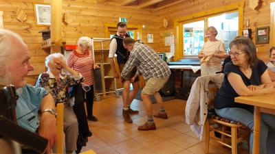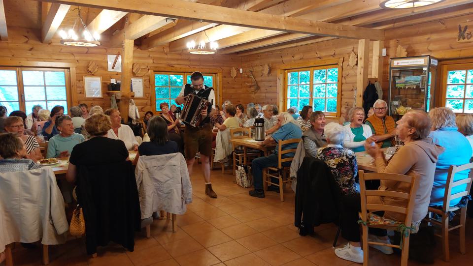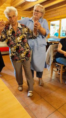 Nach der Kaffeestunde kam ein Unterhalter mit Akkordeon und Ziehharmonika aus dem Spreewald, der allen Frauen und Männern ihre Krankheiten vergessen ließ. Hilde Ebel zum Beispiel ist nur mit Rollator oder Gehilfen unterwegs, konnte aber zur Annemarie-Polka mit Claudia ohne diese tanzen. Die Lieder konnten besonders unsere Älteren textsicher mitsingen und zum Schunkeln gab es auch reichlich Gelegenheit während der zwei Stunden. |
