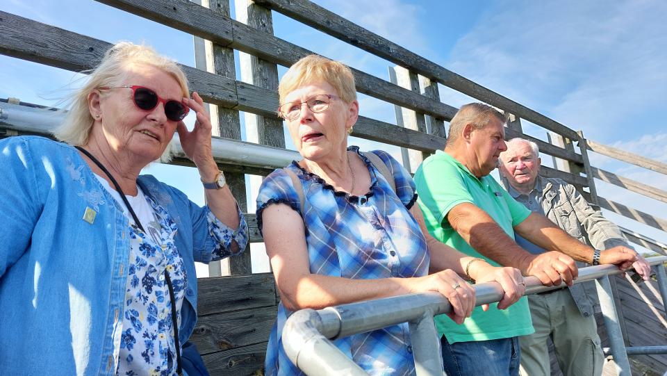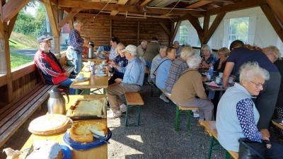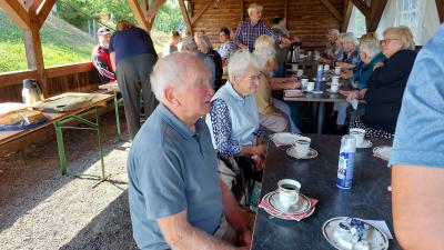 Der letzte schöne Sommertag am 27. August war perfekt für unseren geplanten Ausflug zur Schanze. Der Wintersportverein (WSV) empfing uns genau nach zwei Jahren zum 2. Mal und wieder mit Kaffee und Kuchen von den Frauen des Vereins gebacken und serviert. Günther Lüdecke - im Verein für Finanzen und Veranstaltungsorganisation zuständig - begrüßte uns 26 Frauen und Männer mit einer kleinen Einführung an die Anfänge des Schanzenbaues. Joachim Buß hörte das besonders gern, weil er seinerzeit mit seinem Bagger daran beteiligt war. Es berührt schon sehr, wie stolz das 90jährige Herz auf seine Spuren an diesem Teil der Bad Freienwalder Geschichtsschreibung ist. |