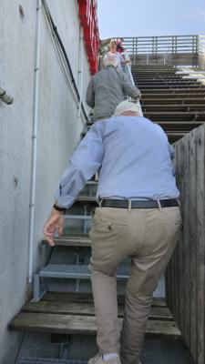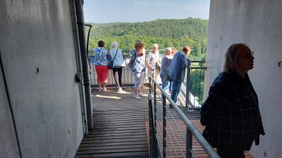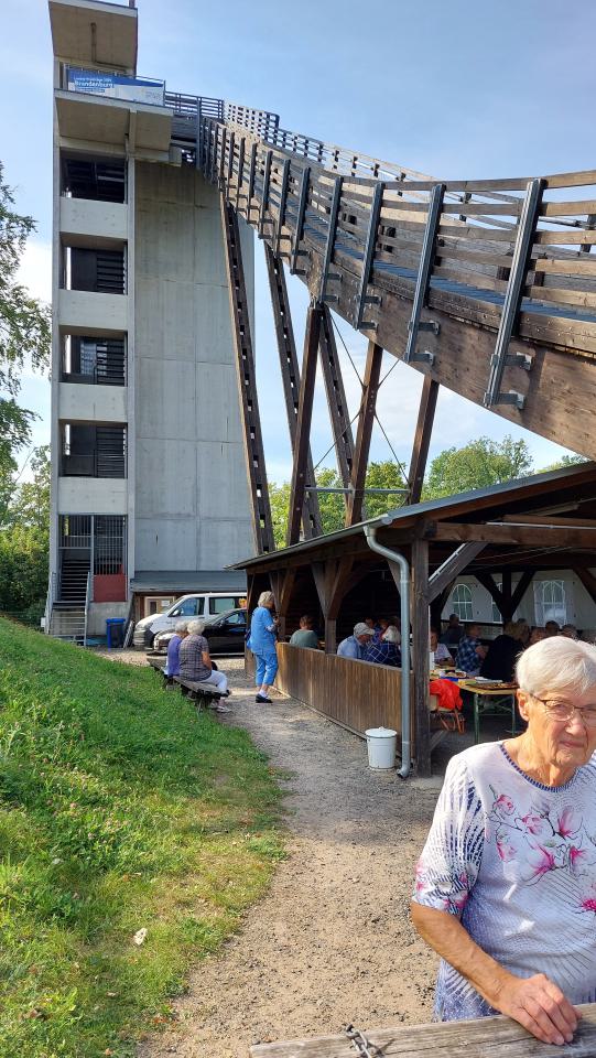 Noch beim Kaffeetrinken nutzte unsere Geburtagsfee Claudia die Gelegenheit, den Geburtstagskindern des Monats Juli nachträglich zu gratulieren. Unser Neumitglied Heidi Haucke feierte am 13.Juli und Isa David (80) am 19. Juli Geburtstag. Am 24.Juli wurde unser ältestes Mitglied und gleichzeitig die älteste Bewohnerin von Altranft 95 Jahre alt. Das Geburtstagslied rundete den Einstand für Heidi Haucke ab. Gut gestärkt ging es für uns an den Testbetrieb des Fahrstuhls, durch den auch unsere hochbetagten Mitglieder auf die Aussichtsplattform gelangten. Hier oben wehte ein anderer Wind... Ein paar ganz Mutige kletterten sogar die letzten Stufen hoch, die für die Skispringer vorgesehen sind. Aber selbst Gerhard Rossow (91) und Joachim Buß (90) ließen es sich nicht nehmen, bis ganz nach oben über die Wipfel der Bäume den Wolken ein Stück näher zu gelangen. Diese Gelegenheit kommt für sie sicherlich nicht wieder. Einige wollten auch von der Schanze springen, aber leider passten ihnen die Skischuhe nicht... Alle genossen diese wunderschöne Aussicht, die Haare vom Winde verweht. Unterhalb des Turmes wieder angekommen, war der Blick in das Brunnental immer noch herrlich und auf den Bänken sitzend und erzählend ging ein wunderschöner Nachmittag an diesem besonderen Ort zu Ende. |