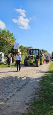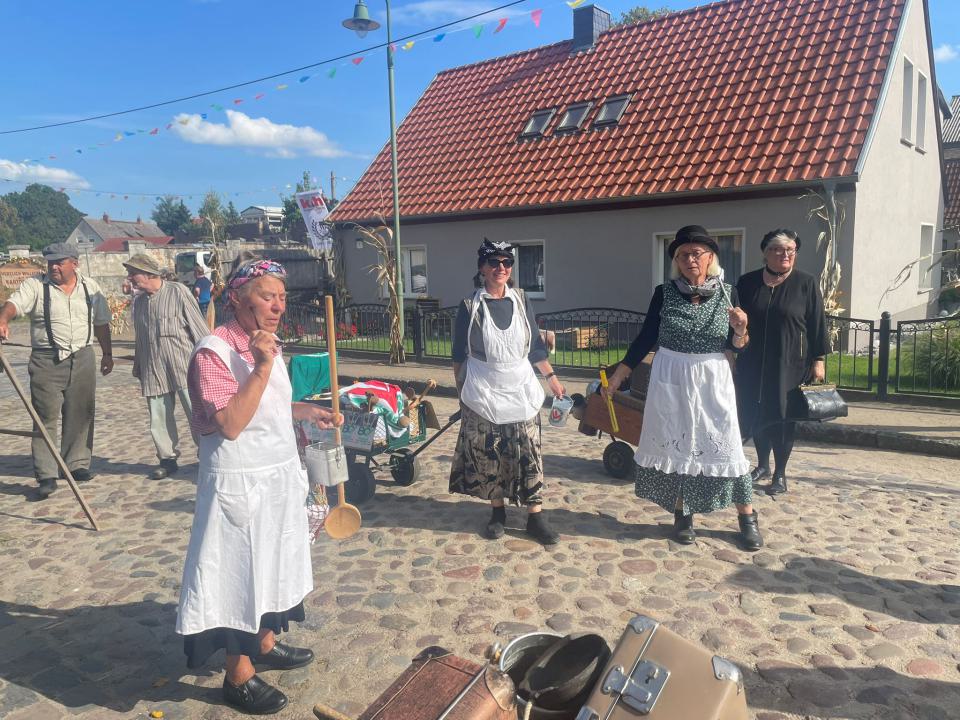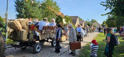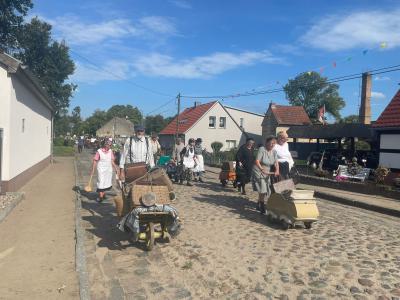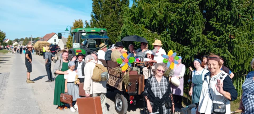 Es ist schon merkwürdig, wie ein Rollenbild wie das unsere jede Persönlichkeit prägt und auch die Gruppe zusammen schweißen kann. Alle haben eigene Erinnerungen oder die der Familie aufgefrischt oder Bücher gelesen und Filme aus dieser Zeit geschaut. Obwohl es auch ein Ernteumzug war, haben wir doch versucht, so authentisch wie möglich zu wirken und mental waren wir es auch. Mit 30 mitwirkenden Personen, auch einige Nichtmitglieder aus dem Dorf, waren wir ordentlich im Umzug vertreten. Trotz des gewaltigen Mammutprojektes für uns und den gesamten Ort, hat uns die Vorbereitung und der Umzug selbst an beiden Tagen großen Spaß gemacht. Nicht nur die Kreativität beim Aussuchen der Umzugskleidung und des Gepäcks hat uns gefordert, auch das Schmücken der Häuser und Vorgärten, war mit und ohne Wettbewerb von tollen Ideen und Lebensfreude geprägt. Das Miteinander im Dorf war großartig und alles in allem war es weniger Arbeit und mehr Spaß an der Freude... |