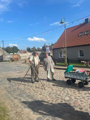 Das 2. Bild, welches wir im Umzug darstellten, war die Gründung der Volkssolidarität im Oktober 1945. Neben Obdachlosigkeit und Hungersnot war diese Zeit durch Chaos und Strukturlosigkeit geprägt. Der Solidaritätsgedanke, die Idee, dass einer dem anderen helfen muss, dass das Volk miteinander solidarisch umgehen sollten, um nicht in Apathie und Lethargie zu versinken, wurde zur Grundidee erster spontaner Vereinigungen und Verbände. Im Bild stellten wir die Volkssolidarität als mobile Suppenküche und mit Sammelbüchse dar. Was lag näher, als uns im 80. Gründungsjahr der Volkssolidarität selbst und ihren Anfang zu zeigen, was viele Menschen nicht wussten. Unser 3. Bild sollte die Bodenreform darstellen, die bereits im September 1945 ihren Anfang nahm. Mit einem 2 Meterzirkel und Bodenreformurkunde wurde J.Presser ausgestattet und K.Zierke zeigte mit Holzpfahl und Hammer, wie die neuen Grundstücke begrenzt wurden. Großgrundbesitzer, die mehr als 100 ha besaßen, wurden enteignet und auch ihr gesamtes Inventar, ihre Häuser und persönlicher Besitz wurde konfisziert. So auch Land und Schloss der Familie Eschenbach in Altranft. |