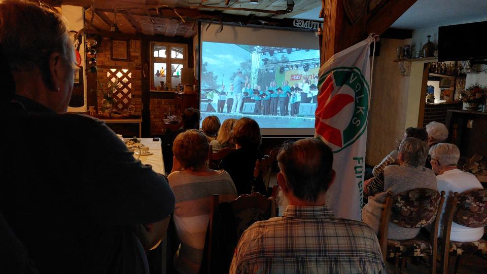 Nach diesem Gedenken an die Geschichte der Volkssolidarität und dem Kaffeetrinken kamen wir zum Höhepunkt dieser Veranstaltung. Günter Grützner filmte während des Erntefestes das Geschehen auf den Plätzen, Bühnen, Höfen und die beiden Ernteumzüge, deren Teil wir waren. Aus diesem dreitägigen Material schnitt er professionell einen Kurzfilm zusammen und zeigte ihn uns auf einer Leinwand in der Bürger- Scheune. Einige kannten ihn bereits, aber gerade die ältesten Mitglieder, die nicht digital unterwegs sind, hatten große Freude daran. Sich selbst auf der Leinwand im Film zu sehen, ist schon etwas Besonderes. Für alle zusammen war nicht nur das Erntefest eine schöne runde Sache, die großen Spaß gemacht hat, auch diese gemeinsame Nachschau im gemütlichem Kreis, war einfach nur schön. Bei Bier und Wein wurde noch lange erzählt und ausgewertet... |