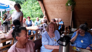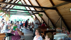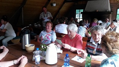 Seit 20 Jahren findet in der letzten Juniwoche das Köhlerfest mit Waldwoche und der abschließende Tanztee seit 2003 statt. Für unsere Gruppe steht seitdem die Fahrt zur Köhlerei fest im Jahresplan. Ein Ritual zu Beginn des Tanztees ist nach der Begrüßung durch die Veranstalter (Stadt Bad Freienwalde, Verein zur Förderung von Beschäftigung und Qualifizierung e.V., Landesbetrieb Forst Brandenburg BT Eberswalde, Stephanus-Werkstätten Bad Freienwalde) das gemeinsame Singen des Köhlerlieselliedes. Klaus Schluchter und Renate Adrian sind langjährige musikalische Begleiter dieser Veranstaltung. Danach bekamen unsere Zwillingsgeborenen von allen Anwesenden ein Geburtstagsständchen. Hier Uschi Schulz. |