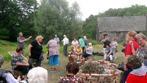 Unsere Sommerumgebungserkundungstour führte uns nach Sonnenburg. Dort wurden die 40 Besucher vom neuen Schloßherrn (hier Werner Gerber) an der Lagerfeuerstelle erwartet. Er erzählte uns, wie und warum er und seine Mitstreiter Sonnenburg für sich gefunden haben und was sie mit dem Anwesen vorhaben. Die Altlastensteine und die bereits abgesägten Bäume sind nicht die einzigen Hindernisse, die es zu überwinden gilt. Mut, Kraft und Ausdauer werden sie neben vielen Mitstreitern brauchen, um aus dem verlorenen Paradies wieder eines zu machen.