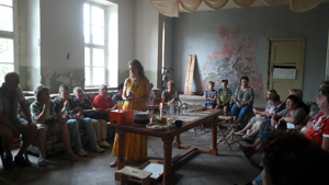 Den Hauch des diskreten Charmes der Bourgeoisie konnten wir im Saal des Schlosses erfühlen. Dort begrüßte uns Silke Schoppe mit Gurkenscheiben und bot Sonnenburger Apfelsaft, Kräutertee, Kuchen und geröstete Beifußblüten zum Kosten an. Als Heilpraktikerin und Kräuterfee möchte sie sich in Sonnenburg einbringen und die Vielfalt der Natur interessierten Menschen näher bringen. Von dem bereits ansässigen Biobauern konnten wir den ins Feld gestellten Kohl, das Gewächshaus mit Gurken und Tomaten und seine ersten drei Ziegen sehen. Wir wünschen allen Glück für die Verwirklichung ihrer Ziele und werden in ein paar Jahren wiederkommen.