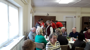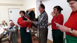Nach der Gratulationszeremonie verteilten vier Vorstandsmitglieder (Inge Mittelstädt,Bärbel Beßler, Gudrun Kutzner, Petra Gellert) in roten Oberteilen und grünen Schürzen - den Farben der Volkssolidarität - die vorbereiteten Sektgläser mit lustiger Deko. Durch Gitarrenunterstützung von Klaus Schluchter wollten wir mit Sektglas in der Hand ein Prositlied singen : "Die Gläser erhebet, die Gläser empor. Gesundheit uns allen, wir singen im Chor". 40stimmig, ohne Noten lesen zu können, haben wir mehr lachend als singend das Lied gesungen bis Uschi Schulz eine gängige Melodie dafür gefunden hat, so daß die nächsten drei Strophen wie von einem guten Chor klangen. Der Sekt machte es möglich. |