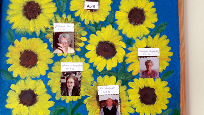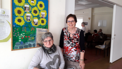 Die mit Sonnenblumen von Brunhilde Nützschke bemalte Pinnwand wird monatlich mit Bildern der Geburtstagsjubilare durch Bärbel Schwoch bestückt. Im April waren es Hilde Ebel, Elisabeth und Willi Gebhardt und Gertraud Koppetsch. Zu unserer großen Freude konnten wir heute zwei junge Mitglieder in unsere Reihen aufnehmen, die den Altersdurchschnitt unserer Gruppe senken und eine Bereicherung für unsere Arbeit sein werden. Christa Grützner und Rita Liebke - sie haben bereits heute die Eingangskasse übernommen. Sie sind beide gebürtige Altranfterinnen, waren arbeitsmässig auswärts beschäftigt und können durch die Volkssolidarität erfahrungsgemäß alte und neue Altranfter viel schneller kennenlernen und integriert werden. |
