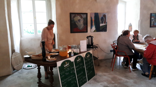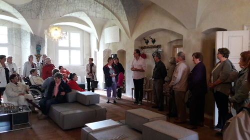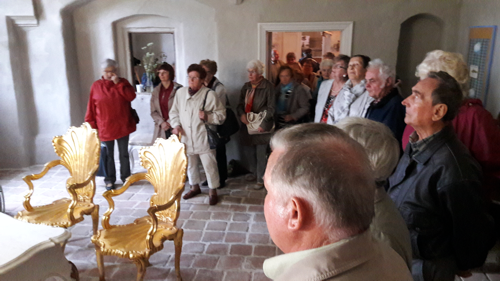Im Schloß empfingen uns Andreas Unterberger und seine Frau Christina Bohin mit österreichischem Charme und Mundart. Er machte die Führung durch das Erdgeschoss und erzählte von der Geschichte des Schlosses und der Uchtenhagens. Ca 1550 erbaut im schlichten Äußeren sollte die Herrschaftlichkeit der Besitzer nicht von außen erkannt werden. Im Inneren gibt es viele Fragen nach der Nutzung seinerzeit, die auch von Experten nicht beantwortet werden können. Im heutigen Hochzeitszimmer, in dem standesamtliche Trauungen durchgeführt werden können, war wahrscheinlich der Empfangsraum derer von Uchtenhagen für die Untergebenen. Interessant war für uns die Geschichte, wie die neuen Schlossbesitzer dieses gefunden haben. Christina Bohin wollte gerne eine kleine Hütte auf dem Lande zum Restaurieren und Wohnen, da sie in Berlin Erfahrungen damit gesammelt haben. Aus der kleinen Hütte ist das Schloss geworden - ein Glück für das Haus und ihre Bewohner. |