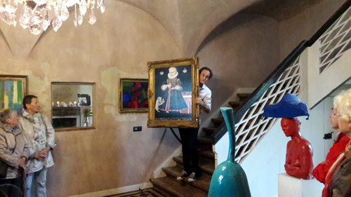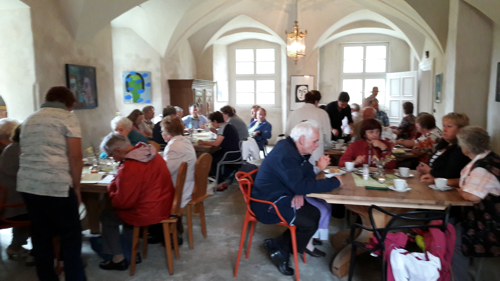 Während Andreas Unterberger noch ein paar wenige Besucher in den Schlosskeller führte, saßen die ersten schon im herrschaftlichen Saal, in dem Christina Bohin ein Kuchenbufett vorbereitet hat. In der Regel fangen wir vor dem Kaffeetrinken mit der Geburtstagsrunde an. Dieses Mal war es umgekehrt. Wir konnten in außergewöhnlicher Umgebung zwei Neumitglieder aufnehmen - Anneliese Fritze und Klaus Zierke. Anschließend gab es das Geburtstagslied und die nachträgliche Gratulation für unsere Juli Jubilare. Horst Teutschebein wurde 80, Anneliese Fritze 75 und Isa David 72. In der letzten Stunde vor der Abreise gönnten wir uns ein Glas Wein und genossen die Bilder und Ausstellungsstücke, die in allen Räumen wunderbar präsentiert sind. So hängen zum Beispiel am Deckengewölbe im Kaminzimmer die riesigen, sehr filigran wirkenden Fische von Sophie Natuschke, die kürzlich mit dem Brandenburgischen Kunstpreis 2017 ausgezeichnet wurde. |