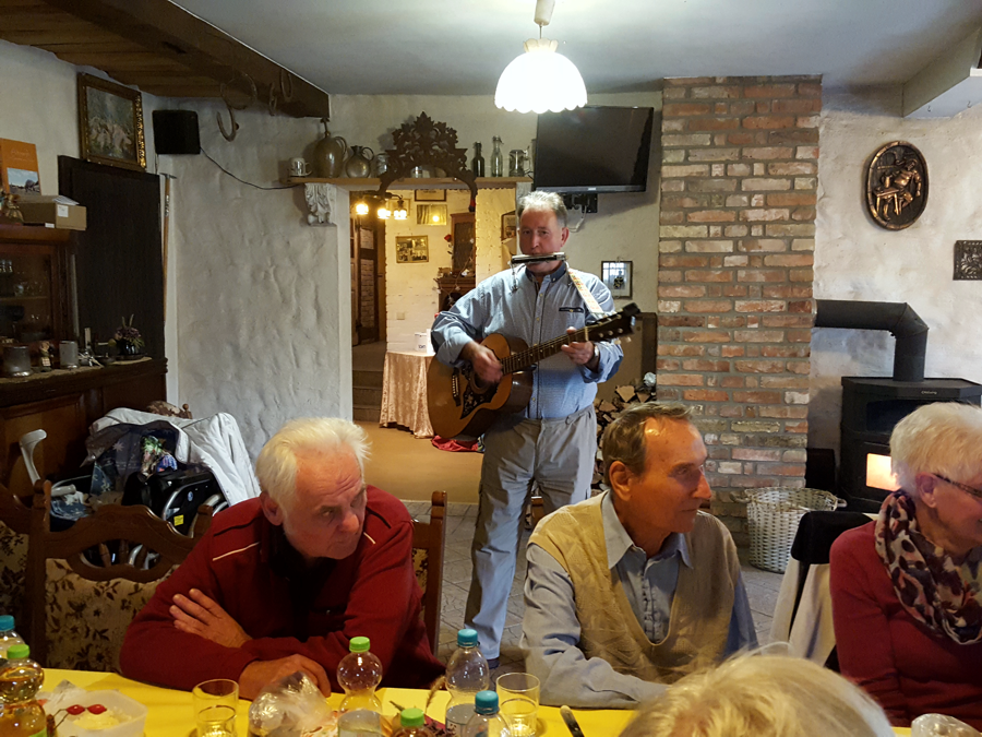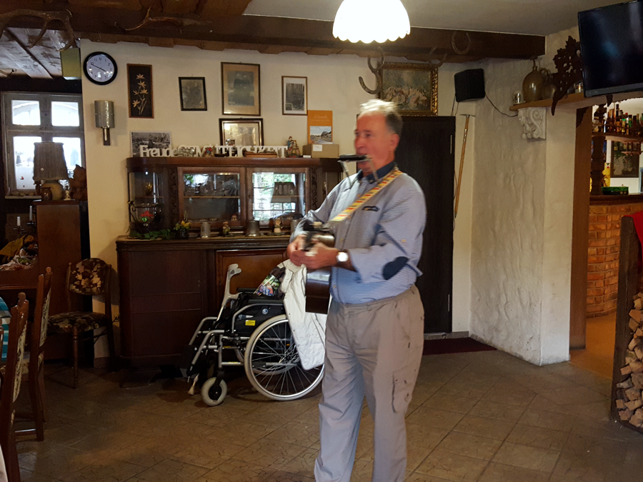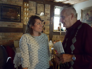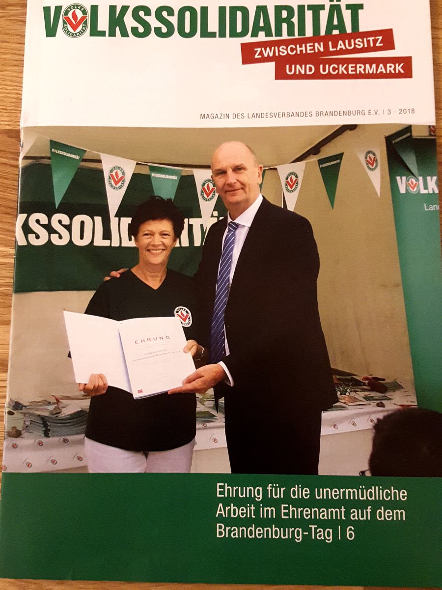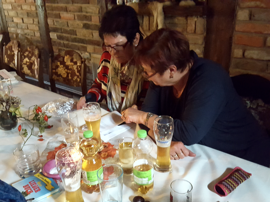 Vor dem Essen kam das gemeinsame Singen mit Klaus Schluchter. Rosi Schluchter, die an diesem Tag ihren 69.Geburtstag beging, erhielt von unserem 28 stimmigen Chor zuerst ihr Geburtstagsständchen. Nach ein paar Liedern teilte sie ihren selbstgebackenen leckeren Apfelkuchen mit Decke für alle Anwesenden aus, weil sie zu Hause Geburtstagsgäste erwartete. Danach ging schon etwas verfrüht die Verteilung der Schlachteplatte los. Das gemeinsame Singen kam somit ein wenig zu kurz, was der Stimmung im Saal keinen Abbruch tat. Klaus Schluchter war dann Alleinunterhalter. Nach dem Essen konnte konnte Jede/r noch eine Portion mit nach Hause nehmen. Nur unser Ehrengast - Anne Papendorf, Assistentin der Vorstandsvorsitzenden der Volkssolidarität Brandenburg, war Vegetarierin. Ein Novum in unseren Reihen. Wir haben Anne Papendorf während des Landeswandertages der Brandenburger Volkssolidarität an der Pfaueninsel in diesem Jahr kennengelernt. Da sie ihre Masterarbeit über die Volkssolidarität schreibt, wollte sie bei uns noch ein paar Eindrücke über die Basisarbeit gewinnen. Sie brachte die neuen Magazine des Landesverbandes und Werbematerial mit. |