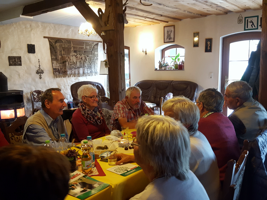 Nach dem langen schönen Sommer und pünktlich zum Herbstanfang schlug das Wetter Richtung Herbst um. Bei Wind und gemäßigten Temperaturen konnten wir Niemandem zumuten, unter freiem Himmel unter der Ulla-Linde zu sitzen und zu singen. So verlegten wir diese Veranstaltung in die Feierscheune der Familie Bürger. Im Vorfeld hatten wir zudem die Schnapsidee, eine Schlachteplatte anzubieten, ohne zu wissen, wie wir diese praktisch händeln können. Zum Glück hatten wir durch den Umzug die große Küche für Vorbereitungen zur Verfügung, die Dank der Hohenfinower Fleischerei in Freienwalde mit Ratschlägen und Wurstsuppe zum Erwärmen der Leber-und Rotwürste prima umsetzbar waren. Auch das Wellfleisch konnten wir nach Wunsch warm und kalt anbieten. Und für den Hackepeter wurde die Kühlkette Dank des vorhandenen Kühlschrankes nicht unterbrochen. Dazu gab es Brot, Butter, Schmalz und Gurken - von Gudrun Kutzner mit frischem Gesundheitspass ausgestattet, professionell angerichtet. Wer wollte, konnte ein frisch gezapftes Bier trinken. Dieter Ganzer stellte sich dafür nach 50 Jahren wieder hinter den Zapfhahn. |