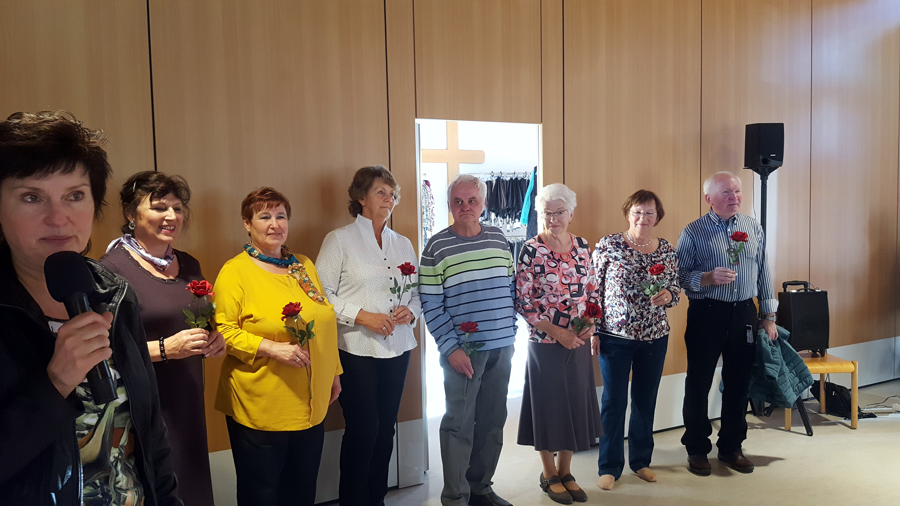 Bevor es mit der Mode losging, waren unsere Geburtstagskinder des Monats zum Gratulationsempfang durch die Blumenfee Inge Mittelstädt an der Reihe. Das Geburtstagslied für alle Geburtstagskinder von allen Leuten im Saal machte den Auftakt. Obwohl der Oktober der geburtstagsreichste in unserem Mitgliederverband ist, waren nur drei anwesend. Gudrun Kutzner wurde 61, ihr Vater Joachim Buß 84 und Bärbel Jänsch 71 Jahre jung. |