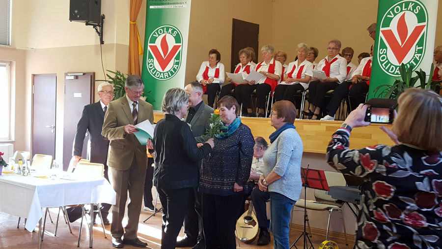 Nach der Geburtstagsgratulationsrunde für unsere Geburtstagsfee Inge Mittelstädt (71) und Cäsar (81) wurde den Ausgezeichneten unserer Gruppe zum 73.Jahrestag der Volkssolidarität gedankt. Unter anderem wurde unser Küken Karin Kleemann in Altzeschdorf für ihre ständige Präsenz bei allen Aktivitäten, für die Vor - und Nachbereitung der Veranstaltungen im Gemeindezentrum und den Beistand unserer älteren Mitglieder geehrt. Die Ehrenurkunde erhielt sie von der Geschäftsführerin der VS Frau Schneider und einen persönlichen Dank vom Verbandsratsvorsitzenden Brandenburg Dr. Bernd Niederland. |