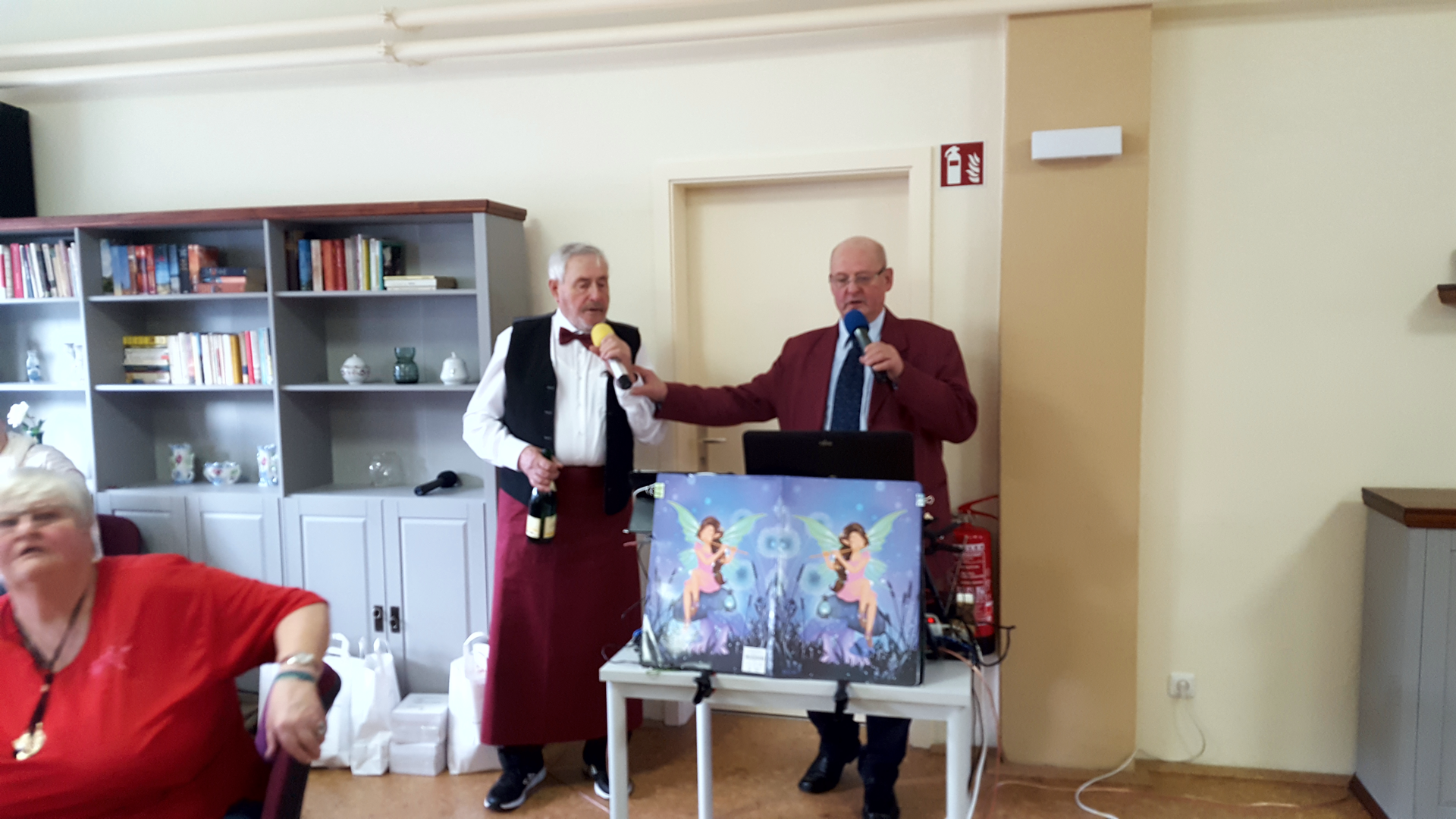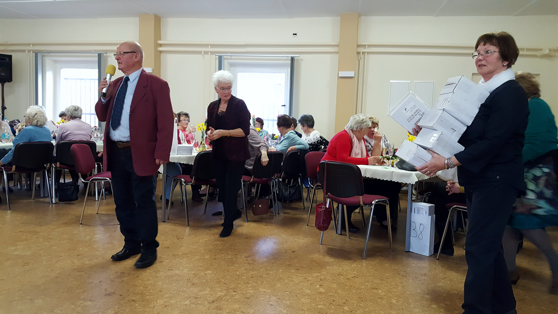 Bernd Krienitz sorgte in den Programmpausen mit Karaokemusik für Unterhaltung und auch hier zeigte Cäsar sein musikalisches Talent. Der nächste Höhepunkt war von unseren Stricklieseln vorbereitet worden. Für einen Taler gab es ein Tombola-Los, welche durch Bernd Krienitz mit passenden Sprüchen kommentiert, eingelöst wurden. Von Puppen über Sammeltassen, Bücher und "Stehrum - chen" hatte jede Frau etwas in ihrer Tüte, was zu ihrem Lebensglück an diesem schönen Tag noch fehlte. Dazu gab es für Jede eine gesponserte Winterdekofigur, denn der nächste Winter kommt bestimmt. Danach konnte endlich getanzt werden und den Abwasch erledigten die Männer in der Küche... |