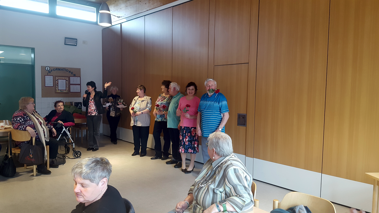 Unsere beiden einzigen Märzgeborenen Dieter Ganzer und Klaus Zierke sind gleichzeitig Model und waren auch nur zur Hälfte anwesend. Dieter fiel aus persönlichen Gründen aus, so dass nur Klaus in unseren Reihen gefeiert werden konnte. 44 Frauen und Männer sangen durch jahrelange Übung auch ohne Inge unser Geburtstagslied für Klaus und die anderen Märzgeburtstagskinder, die hier unerwähnt bleiben, weil sie keine Mitglieder der Volkssolidarität sind. |