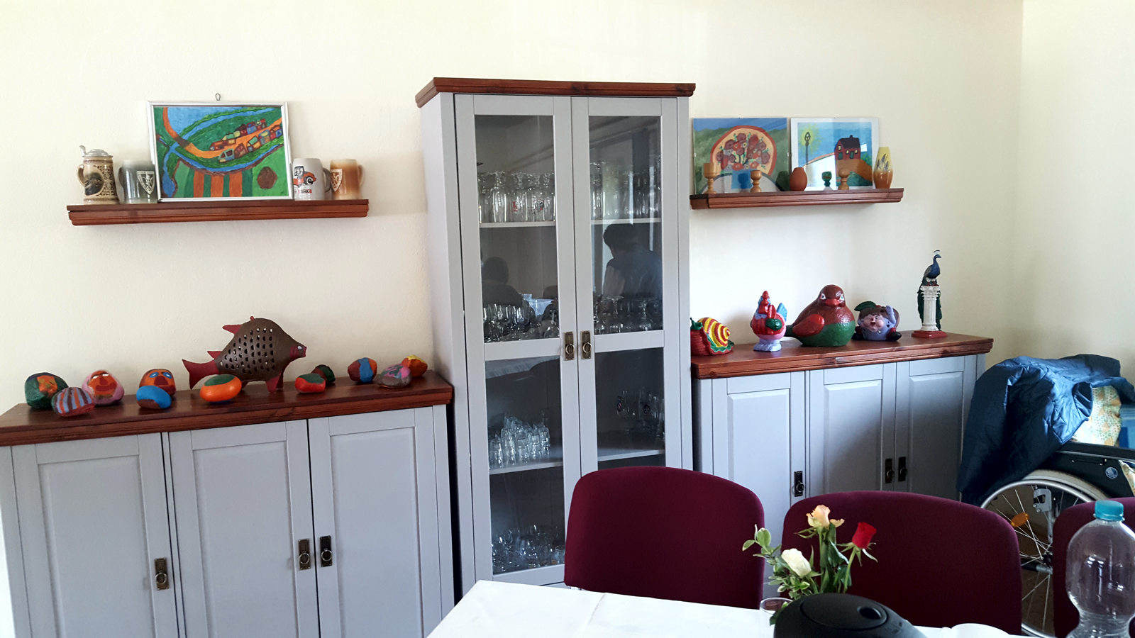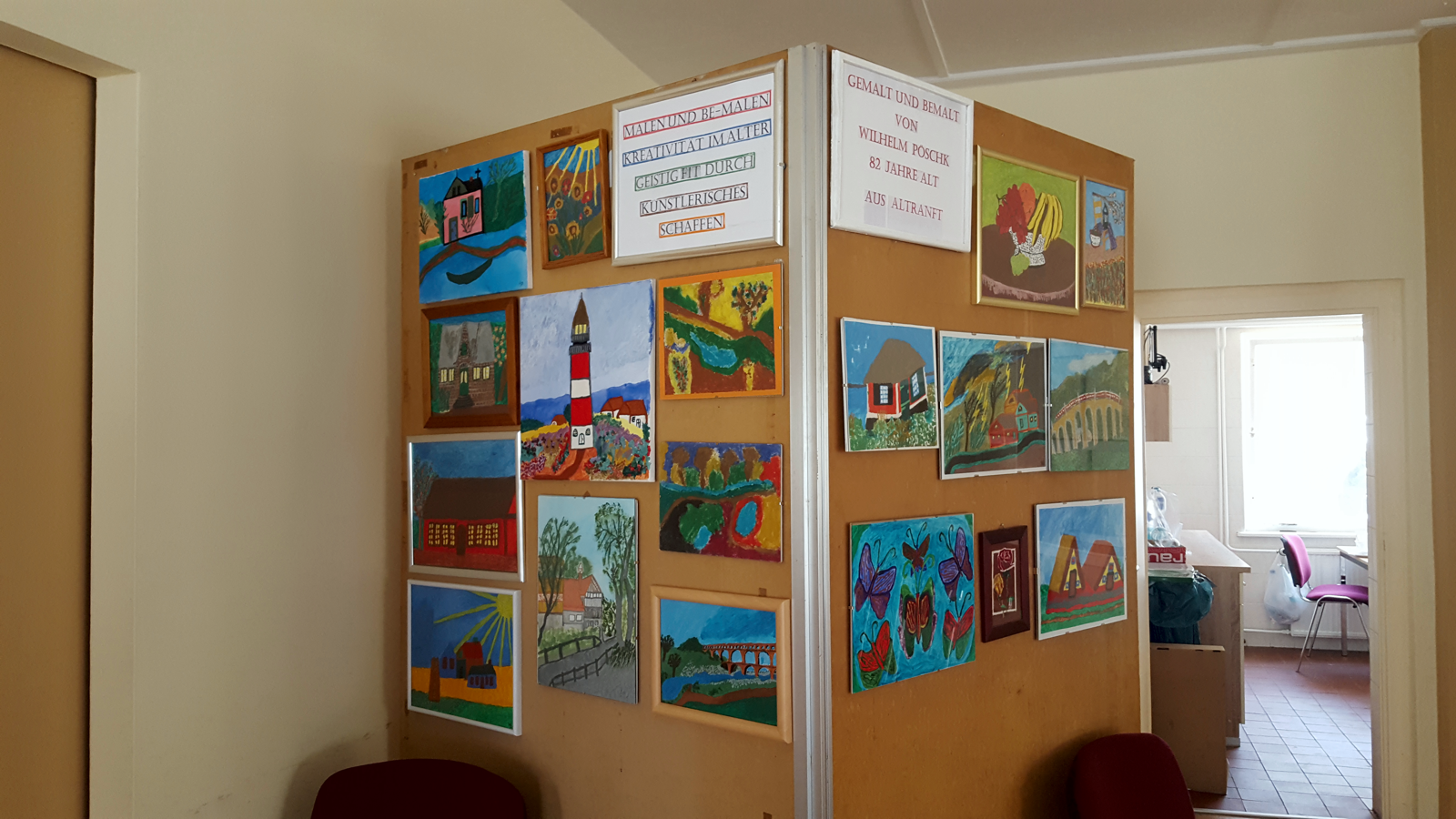 Zur VS - Veranstaltung im Gemeindezentrum wurden wir von Bildern des Neu-Altranfters Wilhelm Pöschk begrüßt, die an einem Aufsteller im Vorraum gehängt wurden. Er ist 82 Jahre alt und zeigt durch die Malerei bzw Steinbemalung seine Kreativität im Alter und wie man durch künstlerisches Schaffen geistig fit bleibt. Seine körperliche Aktivität ist bereits eingeschränkt, deshalb hat er sich der Volkskunst zugewandt, um die Lebensfreude trotz Handicap jeden Tag zu fördern. Die bunten Steine und Tiere sind ein weiterer Ausdruck dafür und für alle Besucher des Gemeindezentrums und besonders am Wahltag zur Freude. |