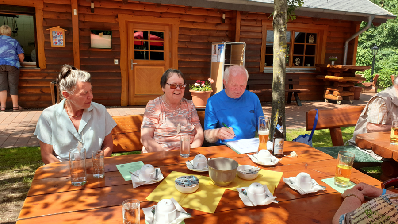 Der Tanzteetag zum Ende der Waldwoche in der Köhlerei läuft traditionell jedes Jahr auf ähnliche Weise ab. Und doch war es dieses Mal anders. Ein filmreifer SEK - Einsatz zwei Tage vorher in einem Vierfamilienhaus im Sonnenburger Weg, der bei Rosi Köpke einen Adrenalinschub und Magenschmerzen auslöste, sorgte dann an diesem Tag für außergewöhnlichen Gesprächsstoff. Weiterhin waren wir durch eine Kommunikationspanne nur eine kleine Gruppe von 12 Personen, die zum Tanztee fuhren. Der große Rest machte eine Brückenfahrt auf der Spree. In der Köhlerei standen vom Köhlerfest die schweren Tische und Bänke noch in der Mitte auf dem Rasen, von Sonnenschirmen geschützt. Wir waren schon seit 20 Jahren beim Tanztee dabei, aber so saßen wir noch nie. Es war einfach toll. Neben uns fanden 10 Mitglieder der VS-Gruppe Bralitz und drei aus der Freienwalder VS den Weg in die Köhlerei. Ein schönes Wiedersehen! |