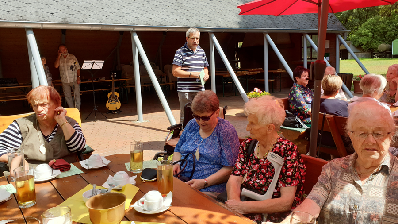 Die Begrüßung aller Senioren nahm der Chef der Stephanus-Werkstätten Roman Bourwieg vor. Frau Schulz-Goldenbaum, seine rechte Hand und für uns als Köhlerliesel zugegen, sorgte für Kucheneintrittsketten in Form eines Holzblattes aus der Stephanus-Werkstattproduktion. Jedes Jahr gibt es eine andere Kette und Jede /r freut sich immer wieder über diese kleine Erinnerung an das Köhlerfest bzw die anderen Waldwoche - Veranstaltungen. Klaus Schluchter war gemeinsam mit seiner Musikpartnerin für die Unterhaltung zuständig. Mit Textvorlage für jeden sangen die Anwesenden "Liesel, Liesel, Köhlerliesel, Du bist so jung, Du bist so schön....". Nach dieser gelungenen Einleitung sangen wir eine Stunde mit Klaus Schluchter seine wohlbekannte Volksliedersammlung inclusive Sonderwünschen durch. Es ist immer wieder erstaunlich, wie Text-und Melodiesicher die älteren Senioren sind und wie viel Freude sie am Singen haben. Eine fast 90-jährige, langjährige Freundin der Familie Schluchter spielte zum Ende auf ihrer Mandoline gemeinsam mit Klaus - eine Premiere für uns und ein unvergesslicher musikalischer Ohrenschmaus. |