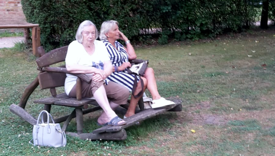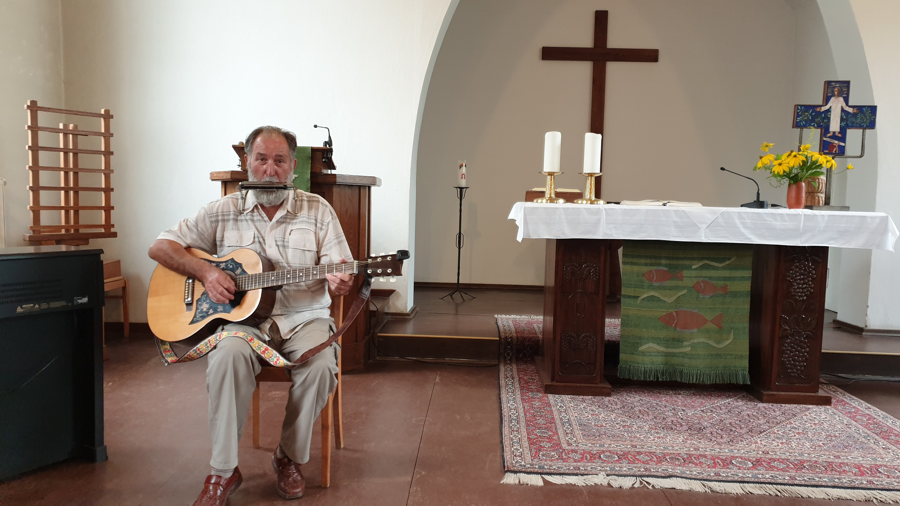 Zum Abschluss in der Kirche spielte Klaus Schluchter auf seiner Gitarre mit Mundharmonika und Gundula Eichler entließ uns zum Kaffeetrinken mit einem Armband der Aufschrift : "Möge der Weg sich vor Dir öffnen und Gott mit Dir sein". Im Gästehaus wurden wir von einer Kaffeetafel mit u. a. Pflaumenhefekuchen überrascht und unsere Geburtstagsfee gratulierte den Juligeborenen Horst Teutschebein, Anneliese Fritze, Isa David und Brigitte Fleischmann zum Geburtstag mit unserem Lied und herzlichen Worten. Nach dem Kuchengenuß der besonderen Art bot Klaus Schluchter allen wanderlustigen Interessenten eine kleine Wanderung zu der Naturfreunde - Wanderhütte an. Die weniger Wanderfähigen sahen sich in dem großen Garten und auf dem riesigen Gelände um. Klaus Schluchter überbrückte die Wartezeit bis zur Abfahrt des Fahrdienstes mit Singen von Volksliedern unter der uralten, verwurzelten Weide. Bänke zum Verweilen, Schauen und Erzählen, eine Schaukelbank und andere Sitzgelegenheiten waren genügend vorhanden. An diesem Tag haben auch wir den göttlichen Beistand gefühlt, denn im Gegensatz zu den vorhergehenden Tagen war die Temperatur durch Bewölkung angenehm, aber der Regen wartete, bis wir wieder zu Hause waren. |