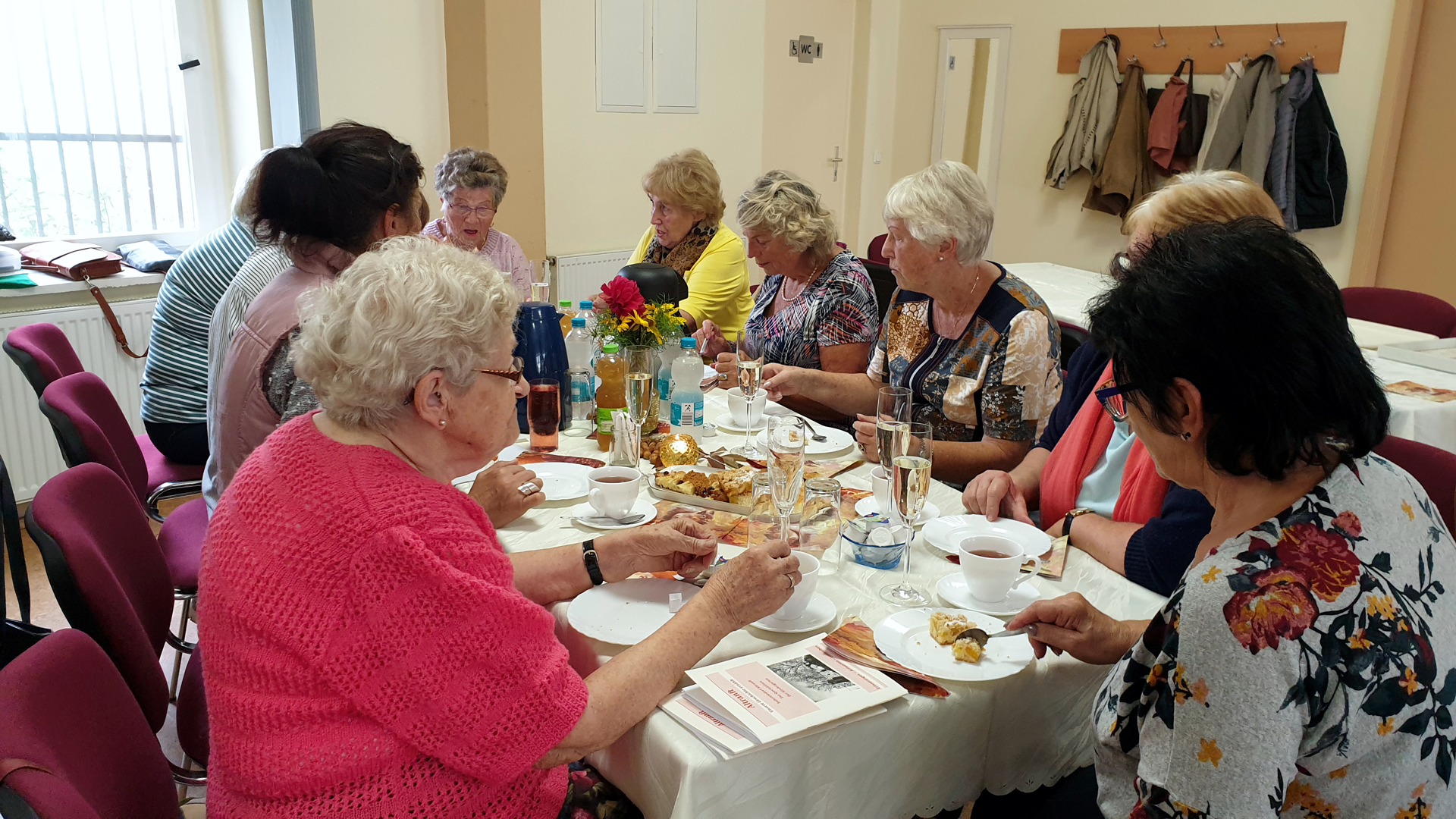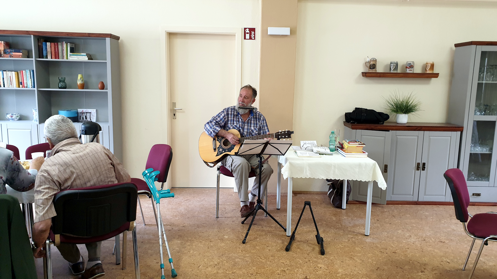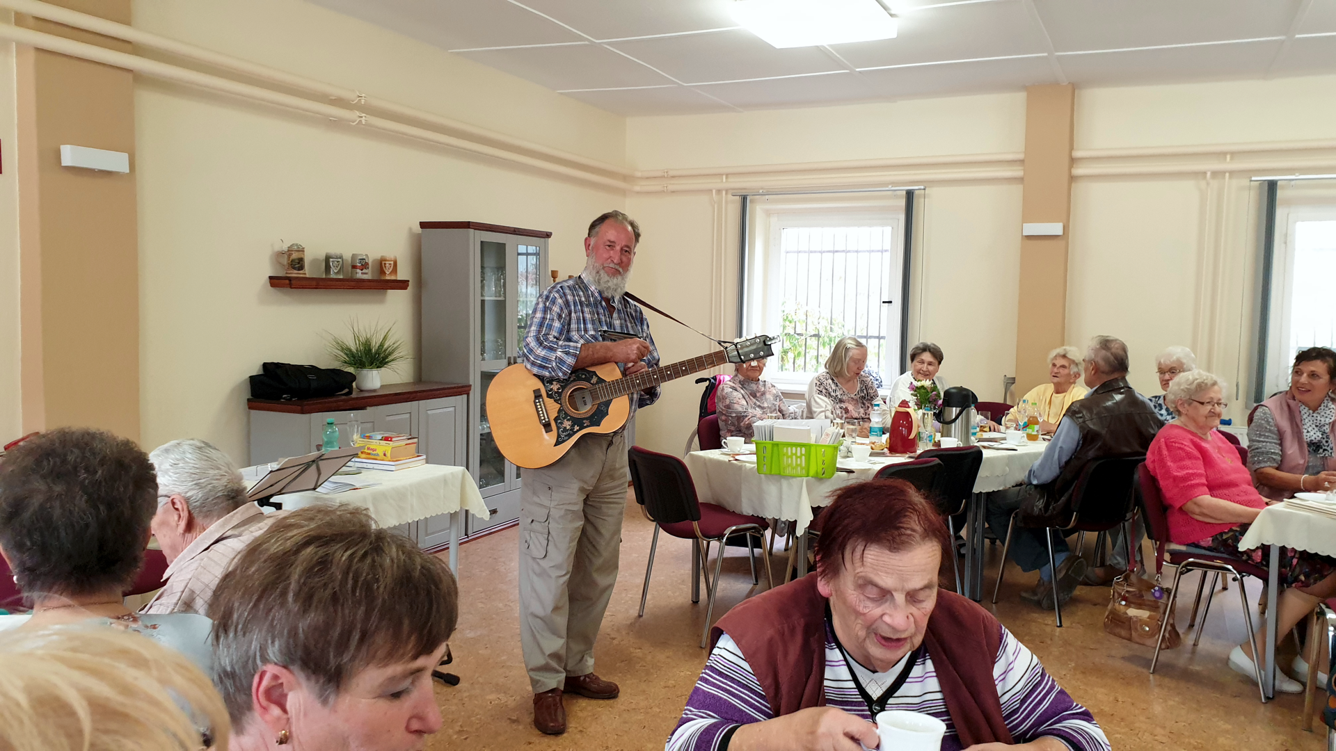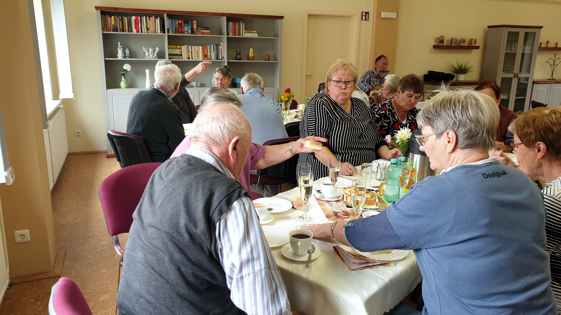 Der von Gudrun Kutzner selbstgebackene Kuchen stand bereits verzehrbereit auf den Tischen. So machte Klaus Schluchter auf seiner Gitarre mit Mundharmonika Kaffeehausmusik zum Kaffeetrinken. Danach Ruhe zum Singen in die Runde zu bringen, war nicht so einfach. Anfangs musste er gegen das Geschnatter anspielen, fand aber die richtigen Lieder zum Mitsingen. Rosi Böhm gab ein Glas Sekt für Jeden anlässlich ihres 70. Geburtstages aus und mit geröteten Wangen und gelöster Stimme sangen wir lautstark : "Trink, trink, Brüderlein trink..." ," Wenn das Wasser im Rhein goldener Wein wär...", oder " Marmor, Stein und Eisen bricht....". Uschi Schulz hatte ein Liederbuch vom Landtag Brandenburg dabei und fand : " Brüder zur Sonne zur Freiheit...", " Bau auf, bau auf, bau auf, bau auf, Freie Deutsche Jugend bau auf... " und weiter ging es mit Seemannsliedern zum Schunkeln. Zwischendurch strapazierte Klaus Schluchter unsere Lachmuskeln ordentlich mit vorgelesenen, noch unbekannten Witzen. |