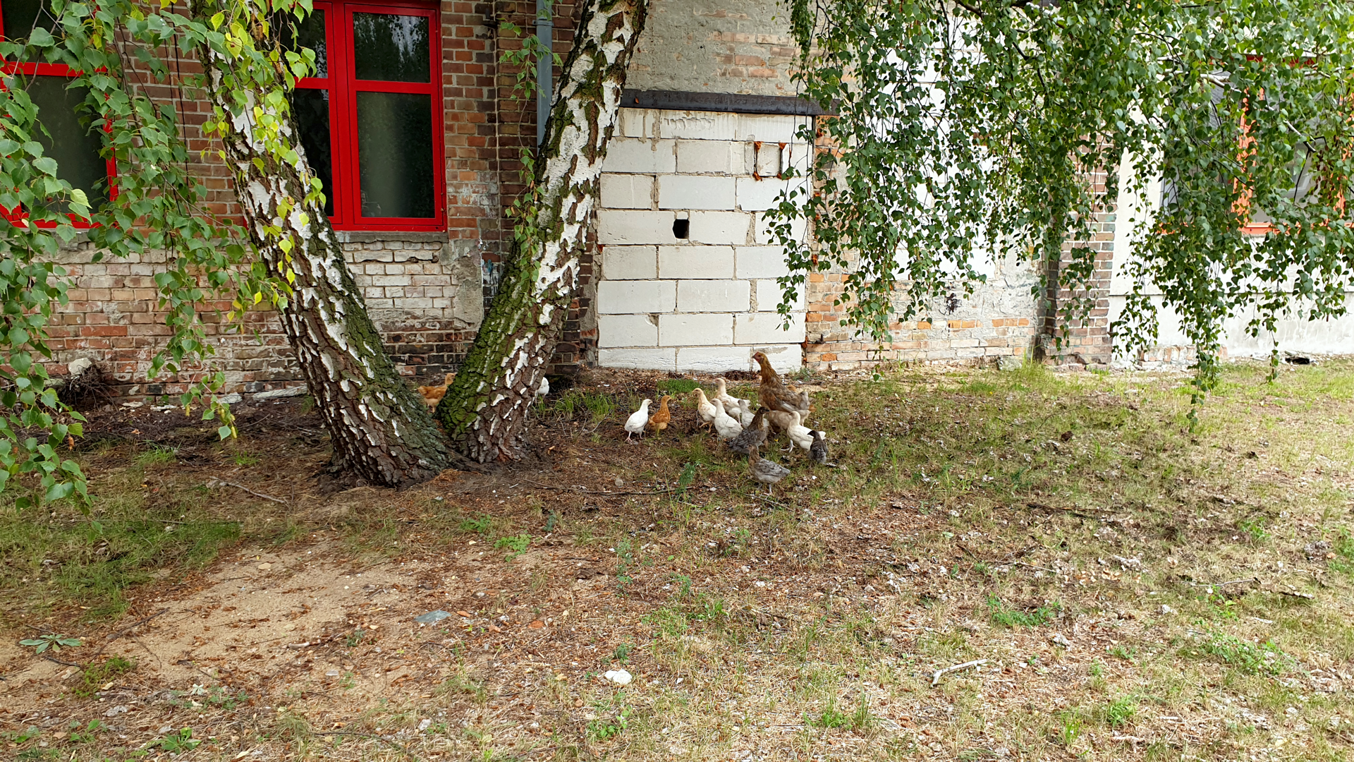 Einen ungewohnten Ausklang fand der VS-Nachmittag mit einem Soljanka - Essen aus Bruno Bürgers Küche. Dazu gab es Baguette in Scheiben. Sowohl der Kuchen als auch die Soljanka wurden mit einem heftigen Applaus gelobt. Singend endete dieser stimmungsvolle, schöne Nachmittag. Auf dem Nachhauseweg gab es noch eine Überraschung zu sehen. Eine Henne mit 13 halbwüchsigen Küken ist vom Nachbargrundstück ausgebüchst und scharte unter der Birke zwischen "Branco" und dem Gemeindezentrum. Ein Bild aus längst vergangenen Zeiten. In einem Museumsdorf ist alles möglich... |