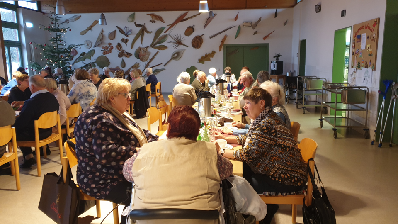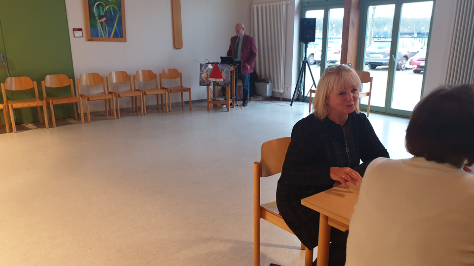 Alle Jahre wieder sehen wir uns in der Stephanus-Stiftung zur Weihnachtsfeier, von der Volkssolidarität organisiert und vom Ortsbeirat unterstützt. Seit der Kommunalwahl am 26.5.2919 hat Altranft eine neue Ortsvorsteherin - Anita Marzini. Sie hatte die angenehme Aufgabe, mit einer Begrüßungsrede die Weihnachtsfeier zu eröffnen. Vorher ließ sie es sich nicht nehmen, jeden der 58 Anwesenden persönlich zu begrüßen. Ein Novum der neuen Ortsvorsteherin war ihre Anwesenheit bis zum Ende der Feier. So genoß sie nicht nur den leckeren Kuchen, auch das anschließende Kindergartenprogramm in der 1.Reihe, den Basar, die Gespräche mit den Menschen, die Kaffeehausmusik von Bernd Krienitz, das gemeinsame Weihnachtsliedersingen nach Textvorlage als Generalprobe zum späteren Singen mit Bläserbegleitung und natürlich das super leckere, liebevoll angerichtete Buffet aus der Stephanus - Küche, welches sie zum Sturm frei gab. |