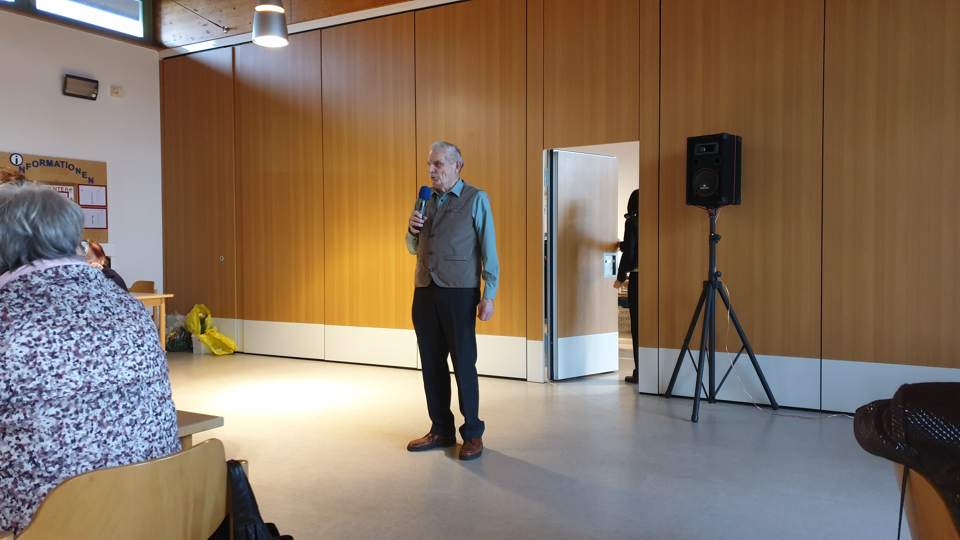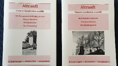 Zwischen der Geburtstagsrunde und der Modepräsentation entstand eine kleine Pause zum Umziehen der Models, die Karl Heinz Schwoch nutzte, um sich bei allen Gratulanten zu bedanken und zwei neue Hefte über die Altranfter Geschichte vorzustellen. Im 17. Heft dieser Reihe wird das Industriedorf Altranft mit Bildern längst vergangener Zeiten und Erklärungen dazu gezeigt. Weiterhin sind Altranfter Sportstätten mit Einblick in den Reitsport ein Thema. Der dritte Punkt stellt die Entwicklung des Kindergartens von gestern bis heute dar. |
