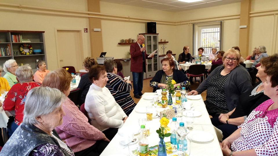 Die Eingangsbegrüßung machte noch Bärbel Beßler und im Saal übernahm Bernd Krienitz das Kommando am Mikrofon. Er führte durch das Programm, sang blumige Lieder wie "Tulpen aus Amsterdam..." zum Mitsingen und Schunkeln, erzählte zwischendurch Witze und bedankte sich bei allen zehn Kuchenbäckerinnen mit einer Rose für die Kuchenspenden.