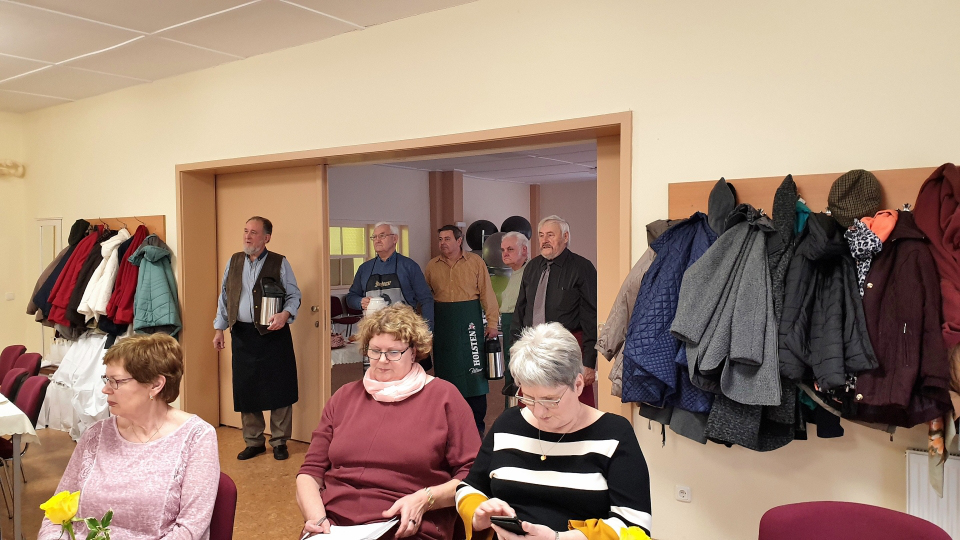 Die fünf Männer - Cäsar, Hans Mittelstädt, Klaus Schluchter, Klaus Zierke und neu im Team Jürgen Presser mit langer Schürze kellnergerecht gekleidet, schenkten zuerst Sekt ein und verteilten dann den Kaffee auf den fünf Tischen. Die beiden Kuchentische trugen sie in die Mitte des Saales, so dass die Kuchen wie auf dem Präsentierteller standen und gut erreichbar waren. Später gab es noch für die 43 Frauen Eierlikör in eßbaren Bechern in Erinnerung an Edith Becker.