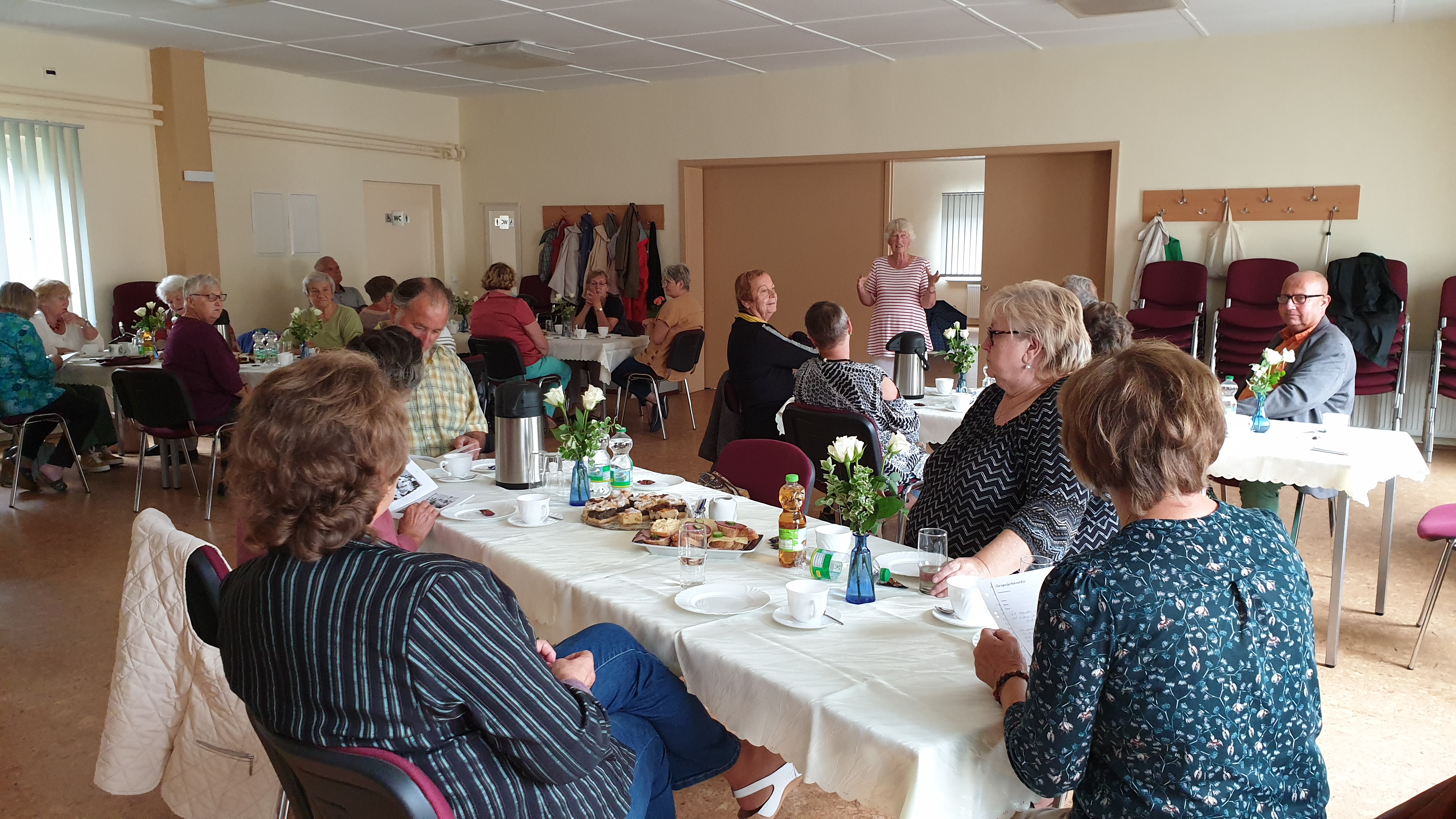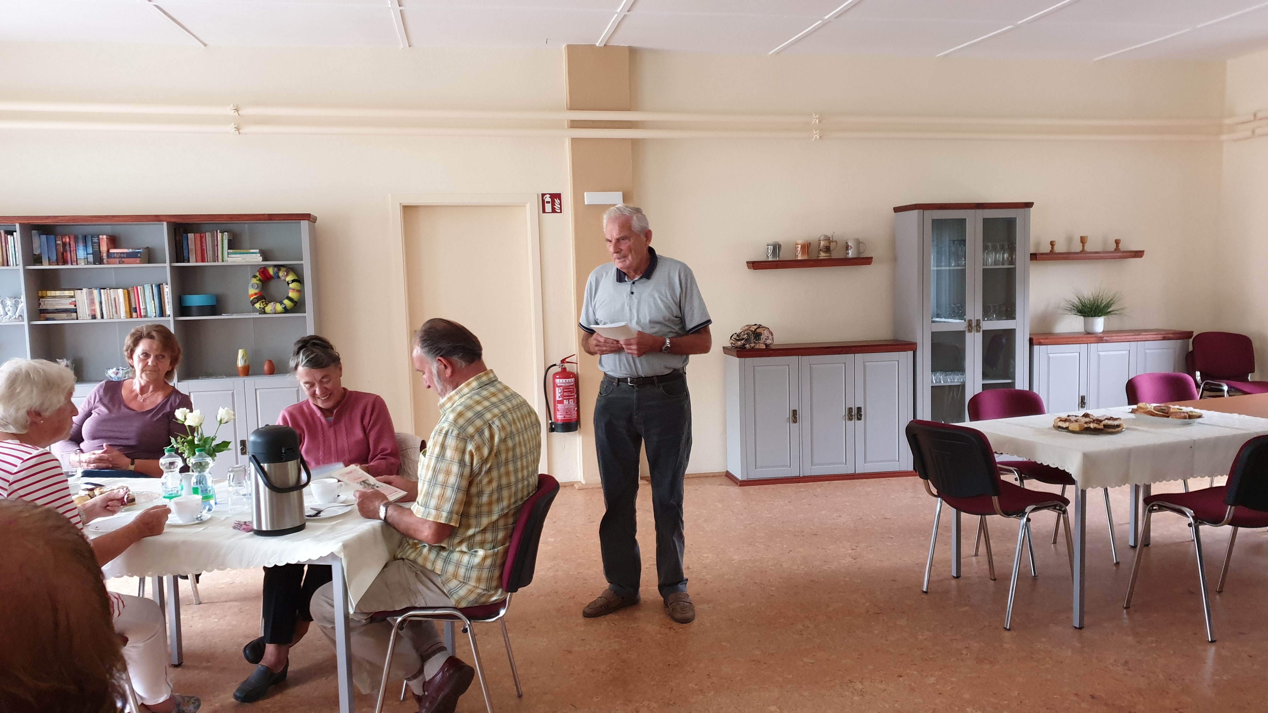 Beim Kaffeeklatsch konnten an einem 10-er Tisch nur sechs Personen sitzen, so dass die übliche, angestammte Sitzordnung durcheinander gewürfelt wurde. Im Nachhinein fanden es Alle in Ordnung, auch mal mit anderen Menschen zu kommunizieren. Nach der Lautstärke zu urteilen, kam Jeder zu Wort. O-Ton Hannelore Fehlemelcher: "Wir haben uns mal wieder so richtig ausgequatscht - von früher und aktuelle Themen."