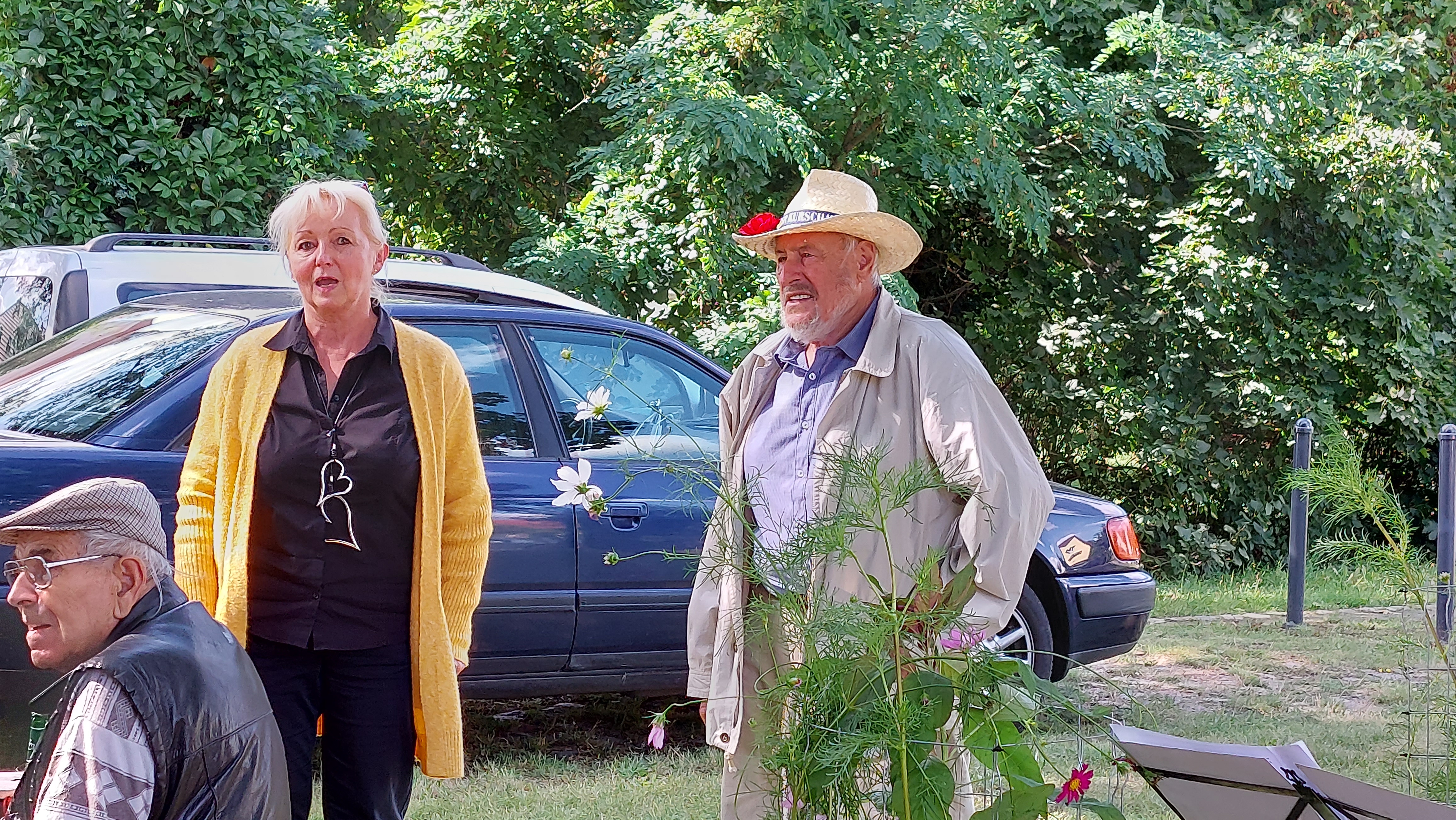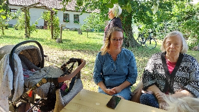 Zur zweiten VS-Veranstaltung 2021, dieses Mal unter der Ulla-Linde, konnten wir nach der Begrüßung durch Isa David endlich wieder unser Geburtstagslied singen. Wir waren an der frischen Luft und Klaus Schluchter hatte seine Gitarre dabei. Zuvor holte er von seinem Grundstück ein paar Stühle für unsere hochbetagten, mit Gehhilfen ausgestatteten Mitglieder, die auf den Bierbänken keinen Halt gefunden hätten. Unsere Geburtstagsfee Inge Mittelstädt gratulierte im Nachtrag den Augustgeborenen Gertrud Friedrich (94), Renate Neumann (69), Erika Batze (80) und Karin Kleemann (63). Der Altersunterschied in unserer Gruppe ist schon bemerkenswert. Während Gertrud Friedrich mit 94 Jahren unsere Alterspräsidentin ist, fuhr unser jüngstes Mitglied Jenny Schulz (41) ihre viermonatige Tochter Luella im Kinderwagen vor. Die stolze Oma Uschi Schulz war als langjähriges Mitglied natürlich auch dabei. Ein wirklich schönes Bild war dieser Drei-Frauen-Generationen-Anblick. |