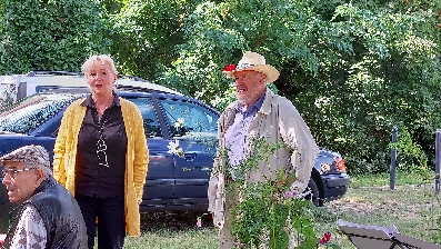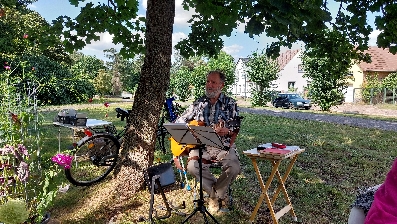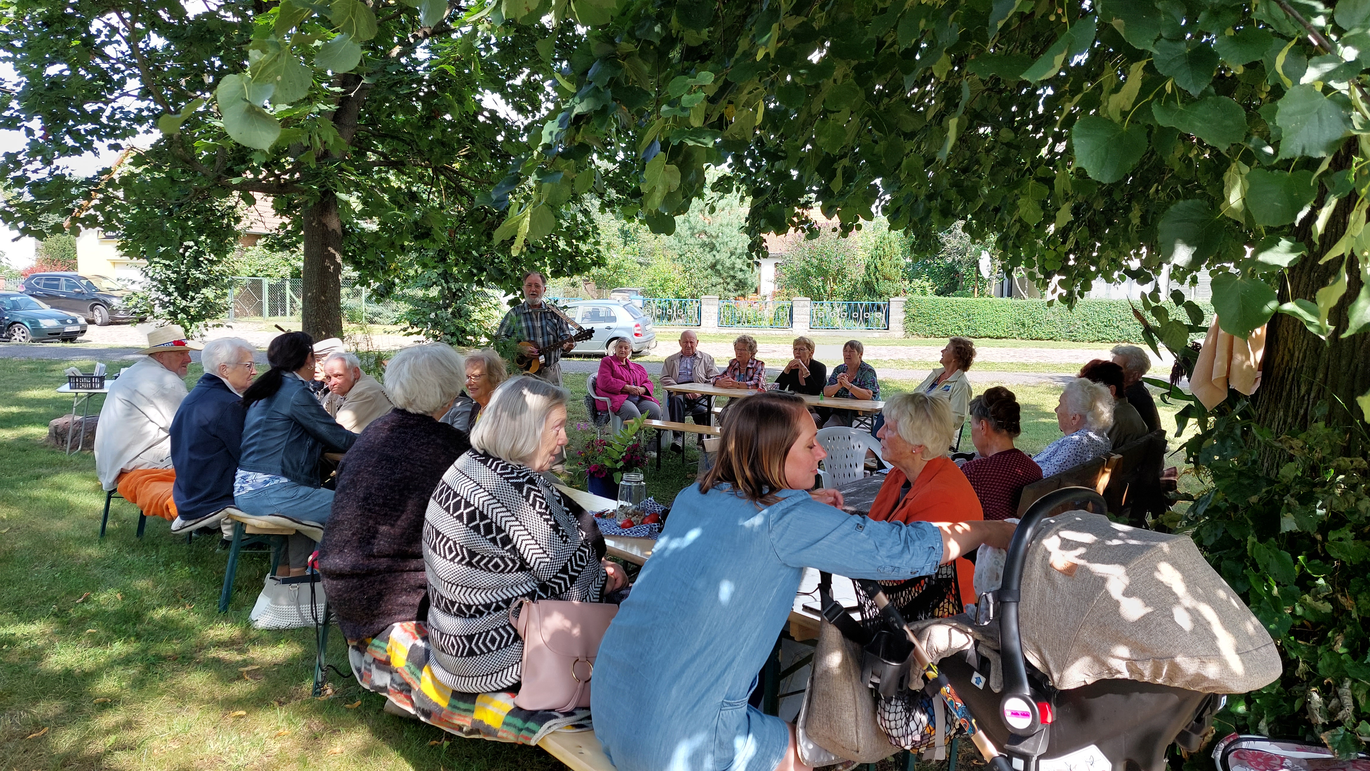 Tags zuvor hat es geregnet und es war ungemütlich kalt. Isa David schickte deshalb eine Info-WhatsApp in die Runde, um uns auf die Schlechtwettervariante in der Bürger-Scheune vorzubereiten. Wir hatten aber das Glück auf unserer Seite mit der Sonne am Himmel und 28 Frauen und Männer konnten draußen sitzen und mit Klaus Schluchter singen. Neben dem Treffen in der VS-Gruppe im Allgemeinen fehlte auch das Singen in der Corona-Abgeschiedenheit sehr. Sowohl das Köhlerliesellied als auch das Oderbruchlied durfte neben vielen, schönen Volksliedern nicht fehlen. Und nachdem Cäsar seine Urenkelin von der Schule abgeholt hatte, wurde sogar " Kam ein kleiner Teddybär..." gesungen. |