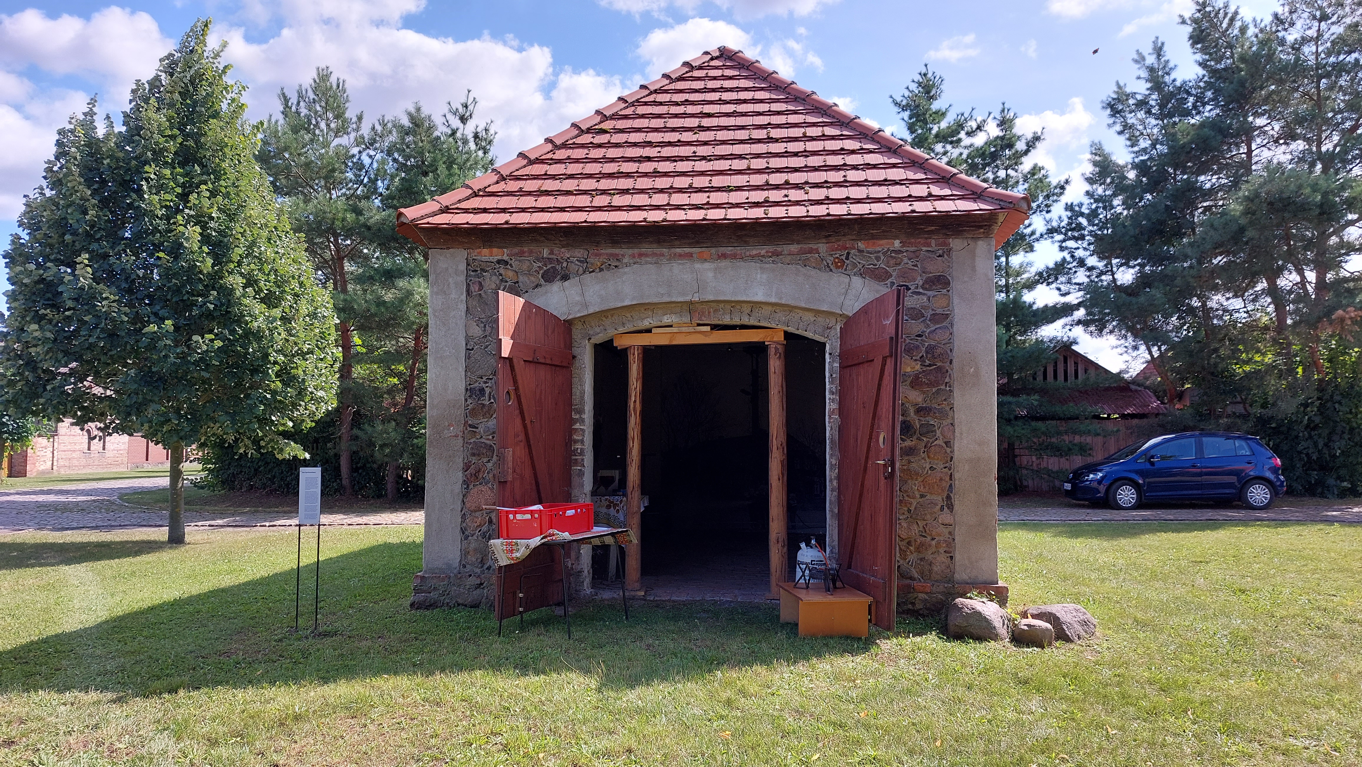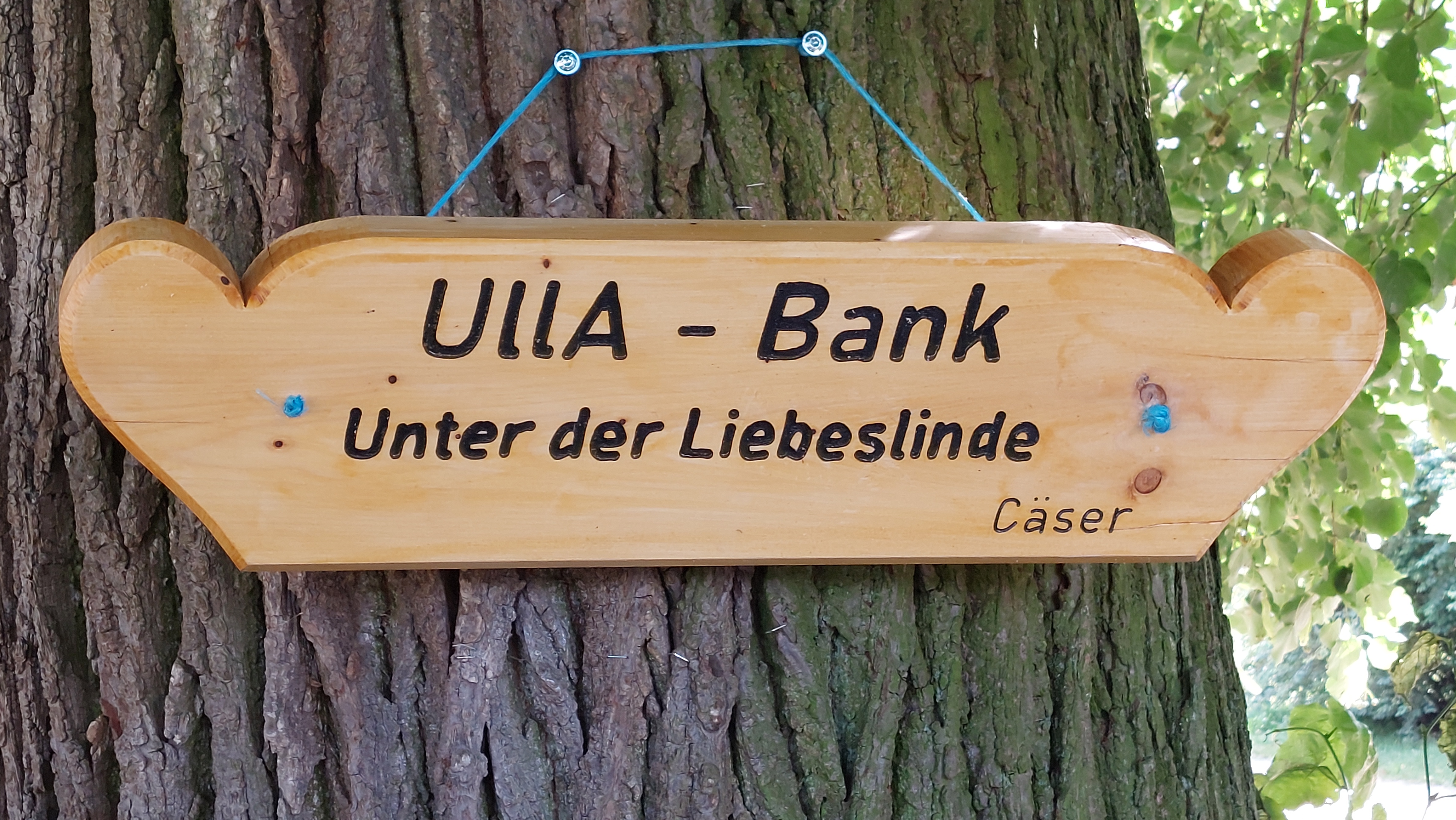 Zu unserer Überraschung war die Ortsvorsteherin von Altranft, Anita Marzini auch anwesend. Der Grund war die Enthüllung des von Cäsar gefertigten Schildes mit zwei Herzen am Rande und der Aufschrift: " Ulla-Bank unter der Liebeslinde ". Die besagte Bank hat er ebenfalls erneuert, weil die Sitzfläche schon ordentlich morsch war. Vor ein paar Jahren hat Cäsar die Linde als "Ulla-Linde" geprägt und am heutigen Tag diese in " Liebeslinde " umgetauft. Da Ulla mit ihren 91 Jahren nicht mehr ewig auf dieser Bank sitzen kann, wünscht er sich sehnlichst, dass verliebte, verlobte und verheiratete Liebespaare die Bank unter der Liebeslinde für sich entdecken mögen. Anita Marzini bedankte sich bei Cäsar nicht nur für diese Bauwerke, auch für seine Vorbereitung des Erntekronenbindens. Gemeinsam mit Arno S. holte er goldgelben Weizen, Roggen, Triticale, Gerste und Hafer von Versuchsfeldern, um genügend Material in hoher Qualität für das Binden der Erntekrone sicher zu stellen. Als Dankeschön gab es für Jeden ein kleines Bierpräsent. |