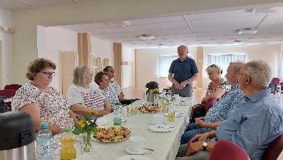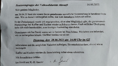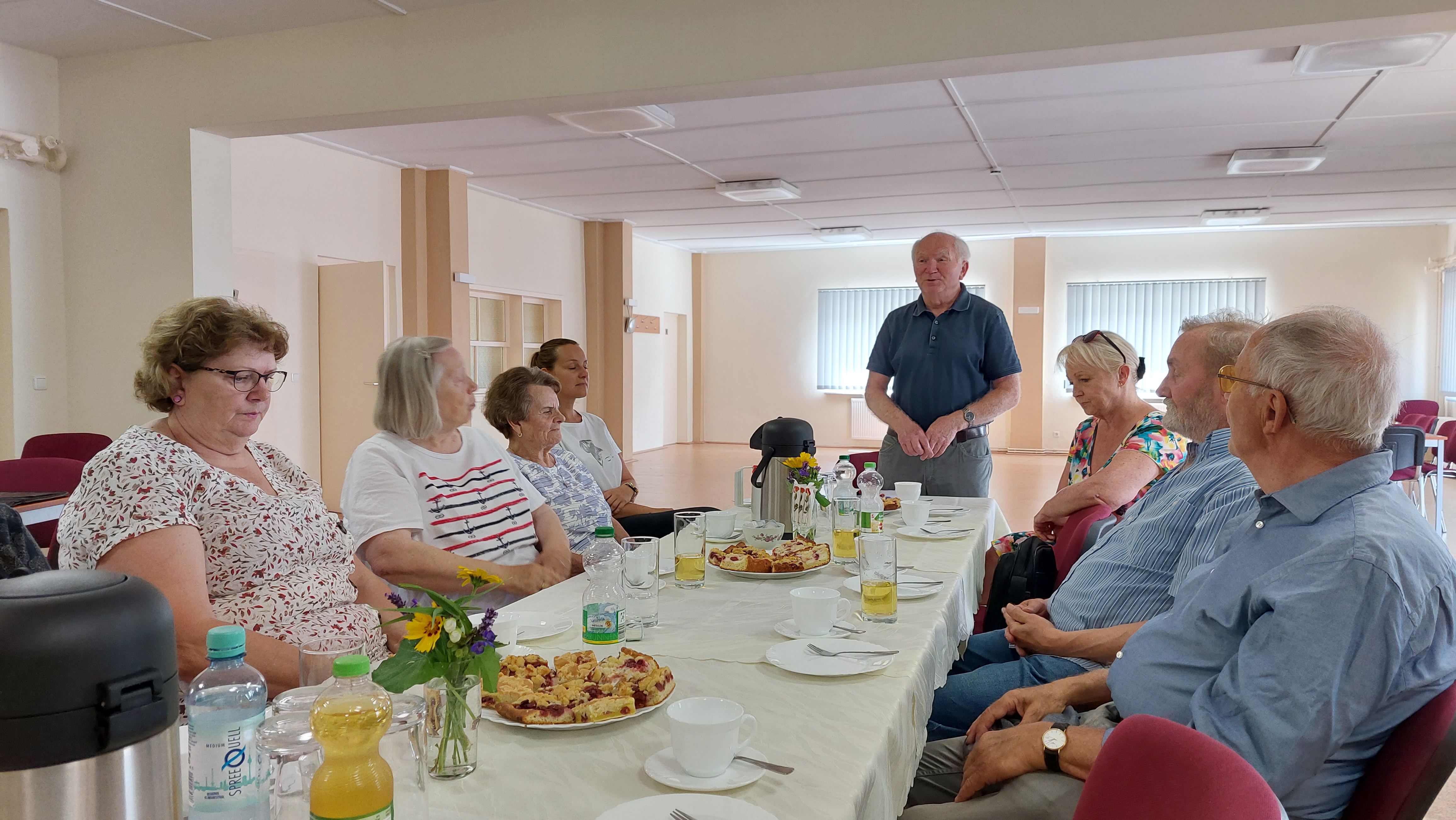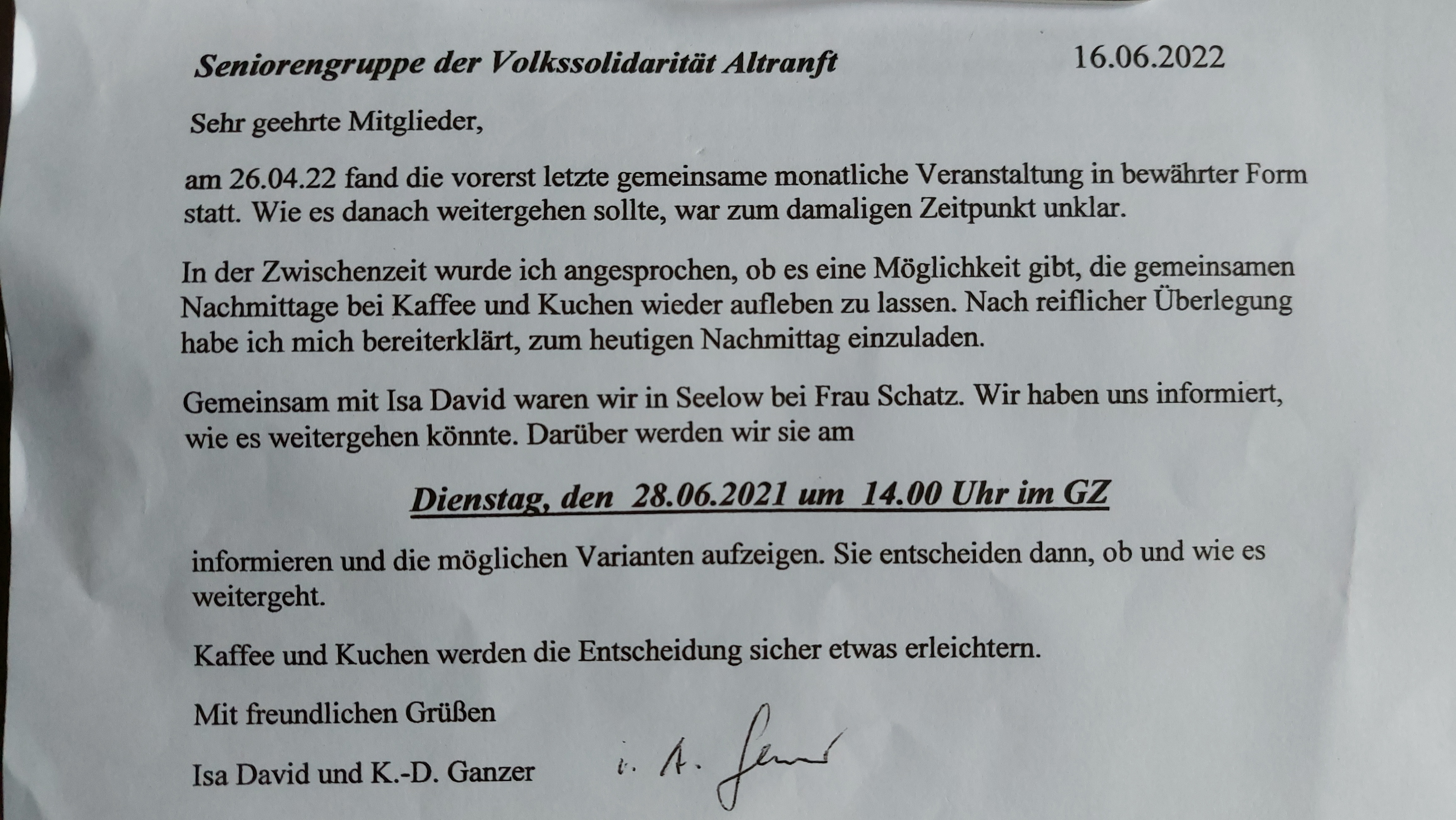 Während im Schlosspark ein großes Kinderfest des Oderbruchmuseums für die Schulen mit entsprechender Geräuschkulisse stattfand, versammelte sich der halbe Rest der Altranfter VS-Gruppe auf Einladung von Dieter Ganzer und Isa David im Gemeindezentrum. Im Vorfeld suchte Dieter Ganzer alle noch verbliebenen 33 VS-Mitglieder auf, um sie persönlich zu dieser Versammlung einzuladen. Selbst im Seniorenzentrum "Bethesda "war er bei unseren beiden dort wohnenden Mitgliedern Erika Batze und Ulla Mittelstädt, denn auch sie sollten wissen, wie es um die Gruppe bestellt ist. Obwohl sie unseren Veranstaltungen nicht mehr beiwohnen können, wollten sie gerne Mitgied bleiben. |